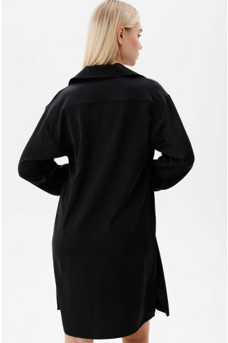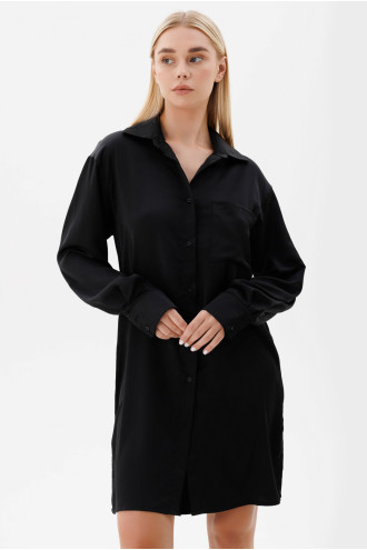 Черный халат-рубашка до колен из шелковистой гладкой ткани, который придаст образу сдержанность и стильность. Модель свободного покроя с отложным воротником на стойке, приспущенной линией плеча, просторными длинными рукавами с притачными манжетами с застежками, отрезной кокеткой на спинке, планкой с застежками-пуговицами впереди, имитацией кармана на груди, шлицами в боковых швах. Халат станет прекрасным вариантом домашнего образа и подчеркнет хрупкость форм.