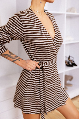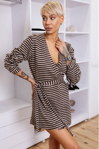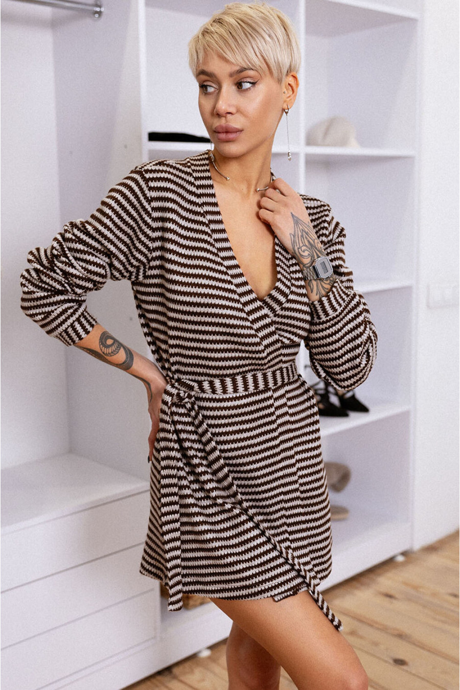 Стильный короткий женский халат-жакет на запах из вязаной фактурной ткани в коричнево-бежевую полоску с узором-елочка. Модель свободного силуэта с глубоким V-образным вырезом декольте с притачной бейкой, приспущенной линией плеча, длинными рукавами с манжетами-резинками, съемным поясом из основной ткани. Халат придаст образу игривость и загадочность, подарит утру флер романтичности и нежности в любое ненастье за окном.