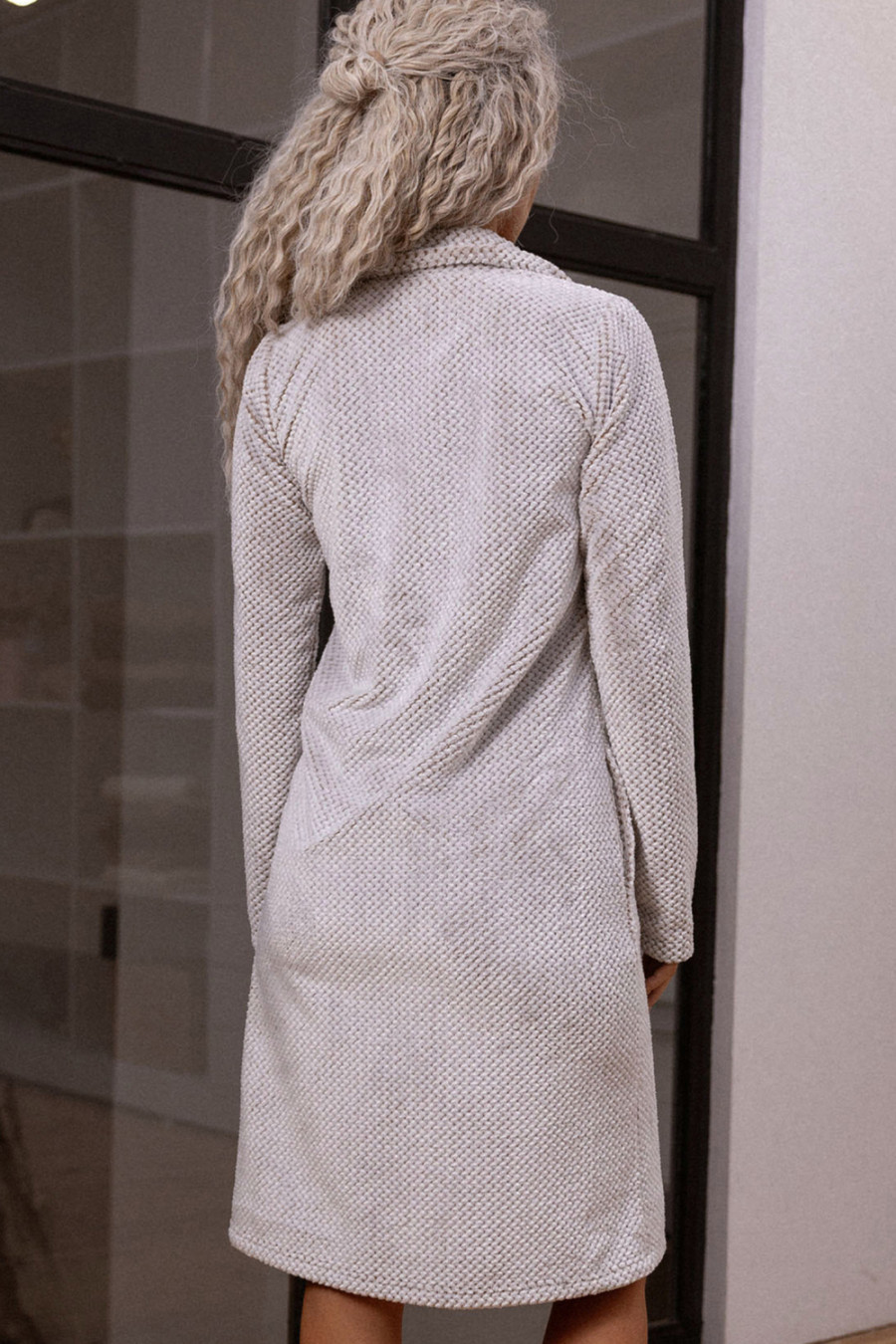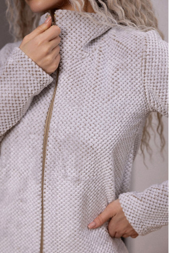 Светло-бежевый домашний халат до колен из мягкого теплого фактурного вельсофта – прекрасный вариант утреннего образа в осенне-зимнюю пору. Модель свободного фасона с высоким воротничком-стойкой, длинными втачными рукавами без манжет, застежкой-молнией от ворота и до середины бедра, шлицей впереди. Халат освежит повседневный домашний образ любой барышни, подарит ощущение комфорта и легкости движения. Наряд сделает ваше утро уютным и приятным.