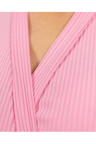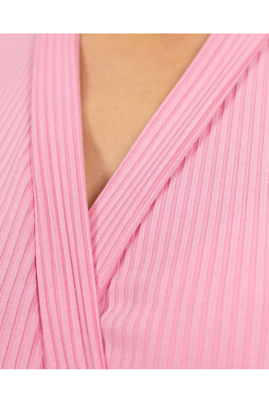 Халатик "Комета Макнота" светло-розового цвета изготовлен из натурального трикотажа, фактура которого имитирует английскую резинку. Фиксируется на запах, имеет свободный силуэт короткой длины и рукав 3/4, по краю обметанный волной. Для фиксации пояса предусмотрены петли в районе талии. Край полочек и горловины отделан двойной кромкой. Благодаря ей изделие хорошо прилегает в области шеи и декольте.