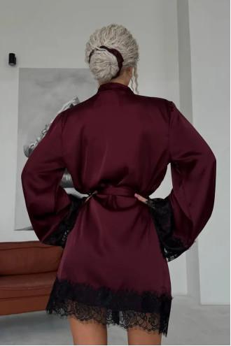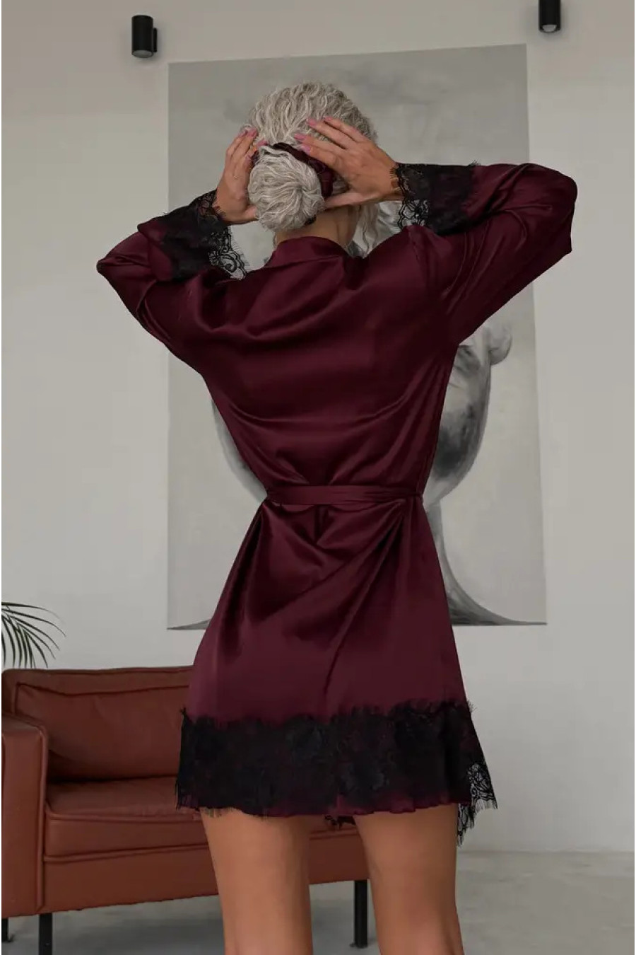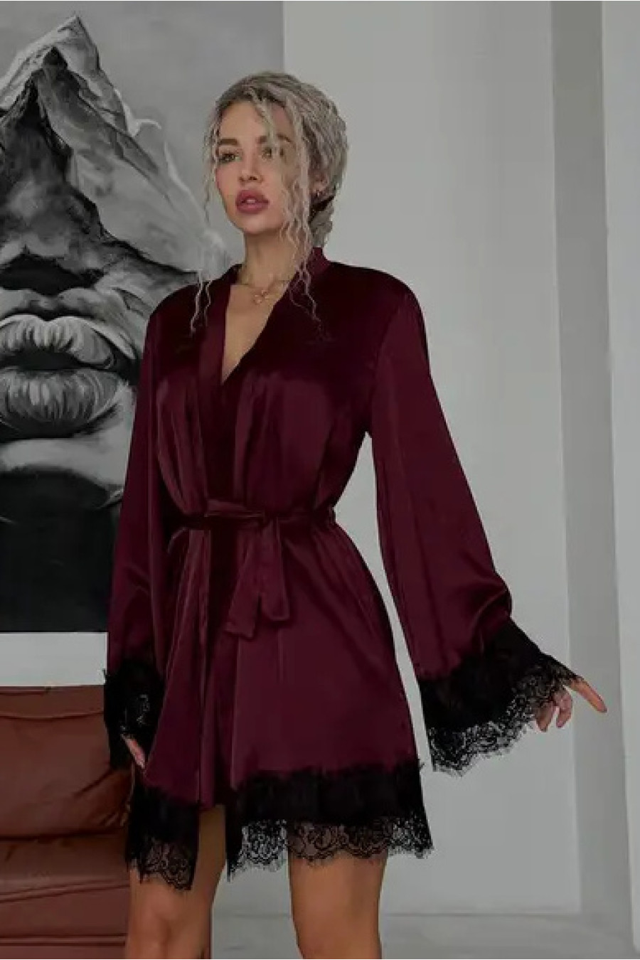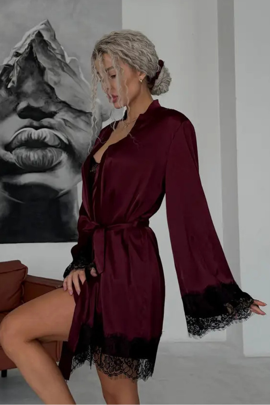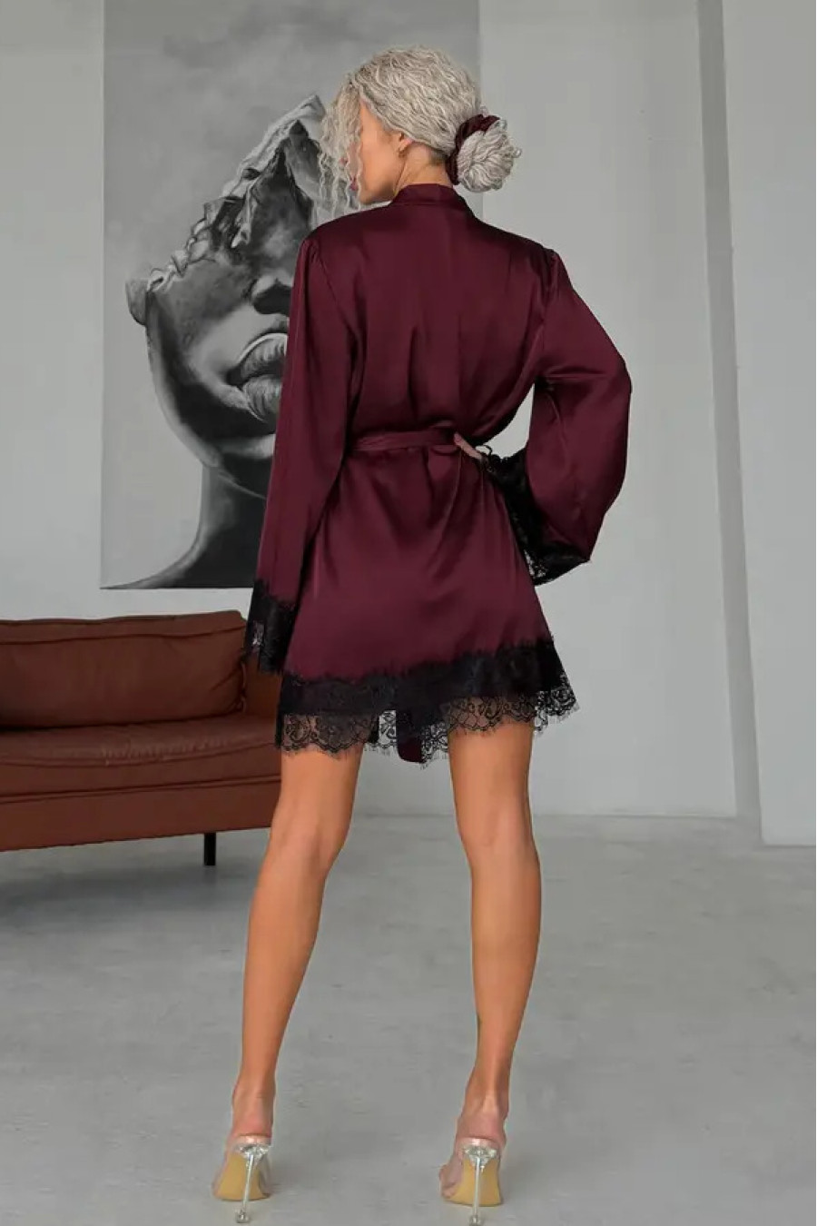Халат на запах «Ванда» бордового цвета изготовлен из шелка Армани, который не мнется, хорошо драпируется, имеет мягкую текстуру. Силуэт свободный. Полы халата фиксируются пояском. Рукав свободного кроя не сдерживает движений и придает комфорт, прикрывая руки. Длина придает образу игривости и женственности. Рукава и низ украшены качественным широким кружевом черного цвета. Халат Ванда можно использовать как часть ночного образа или как элемент коллекции домашней одежды.