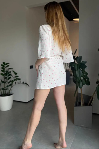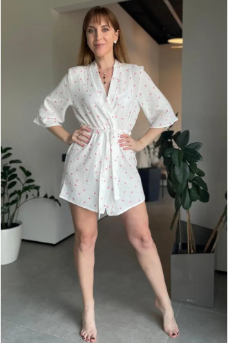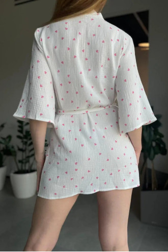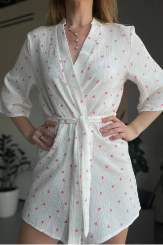 Халатик на запах «Зефир» белого цвета с розовоми сердечками выглядит нежно и женственно одновременно. Короткий крой и длина рукава 3/4 придают образу игривости, изящности. Фиксируется на пояс, благодаря чему можно регулировать силуэт изделия. Натуральная ткань пропускает воздух, что важно при высоких температурах воздуха. Халат нежный на ощупь, приятный к телу и быстро сохнет.