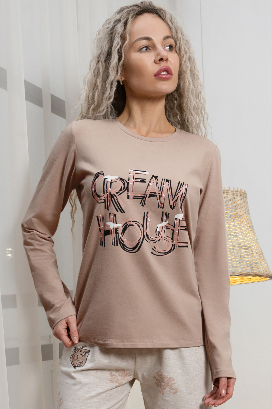 Уютная трикотажная женская комбинированная пижама из мягкой хлопковой ткани кофейно-бежевого и меланжево-серого цвета. Модель состоит из джемпера свободного силуэта с округлой горловиной с резинкой-бейкой, длинными просторными рукавами без манжет и штанов с поясом-резинкой, манжетами-резинками внизу. Пижама подчеркнет хрупкость и утонченность образа, подарит ощущение тепла. Наряд дополнит домашний гардероб любой барышни.