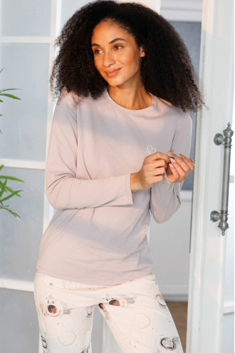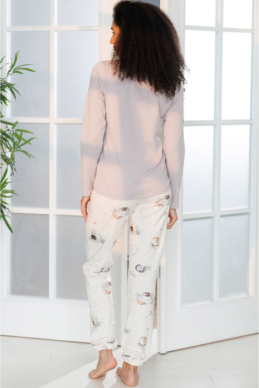Комбинированная женская пижама из приятной на ощупь хлопковой ткани светло-серой и молочно-кремовой цвета с принтом-кофе. Модель состоит из джемпера свободного силуэта с округлой горловиной с резинкой-бейкой, длинными просторными рукавами без манжет и штанов с поясом-резинкой, манжетами-резинками внизу. Пижама подчеркнет хрупкость и утонченность образа, подарит ощущение тепла. Наряд дополнит домашний гардероб любой барышни.