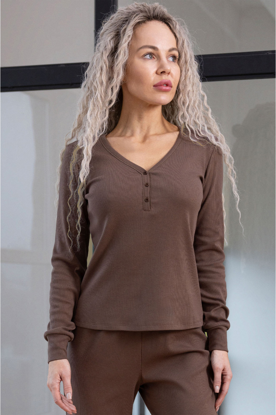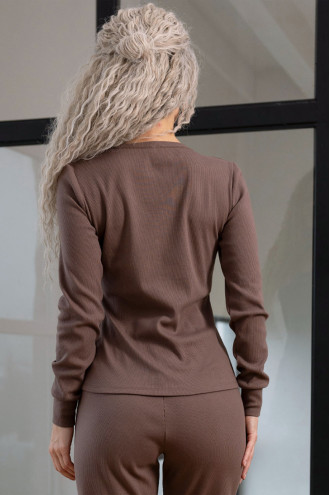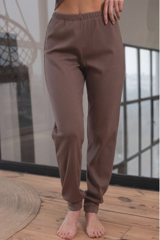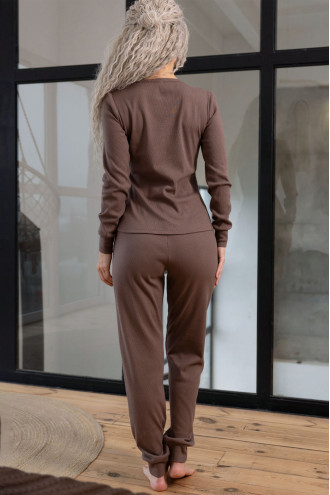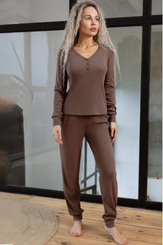 Теплая женская трикотажная пижама из смессовой меланжевой фактурной ткани цвета молочного шоколада с рисунком-рубчик. Модель состоит из кофты прилегающего фасона с глубоким V-образным вырезом декольте, узкими длинными рукавами с манжетами, застежками-пуговицами на полочке и штанов "по фигуре" с поясом-резинкой, высокими манжетами внизу. Пижама подчеркнет хрупкость и женственность силуэта, согреет в холодную пору и подарит ощущение уютного покоя.