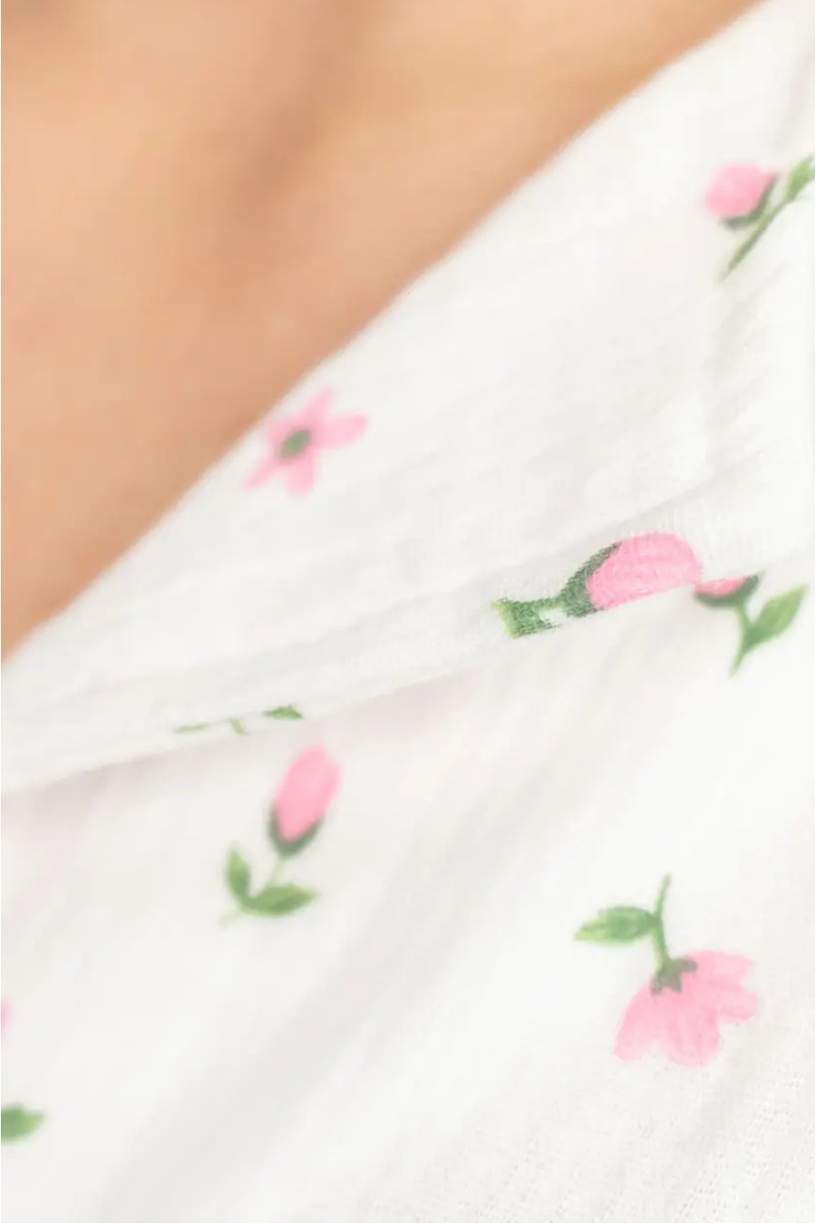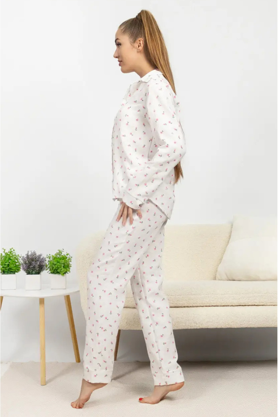 Нежная женская пижама из муслина – идеальный выбор для комфортного сна и отдыха. Комплект состоит из рубашки с длинным рукавом, брюк прямого кроя средней посадки с эластичным поясом. Рубашка с классическим воротничком и аккуратными пуговицами прекрасно гармонирует с прямыми брюками. Модель с принтом тюльпаны выполнена из муслина, который является легким, мягким и гипоаллергенным материалом, что обеспечивает комфорт в течение всего года. Костюм очень удобен и приятен к телу, поэтому дарит приятные ощущения во время сна.