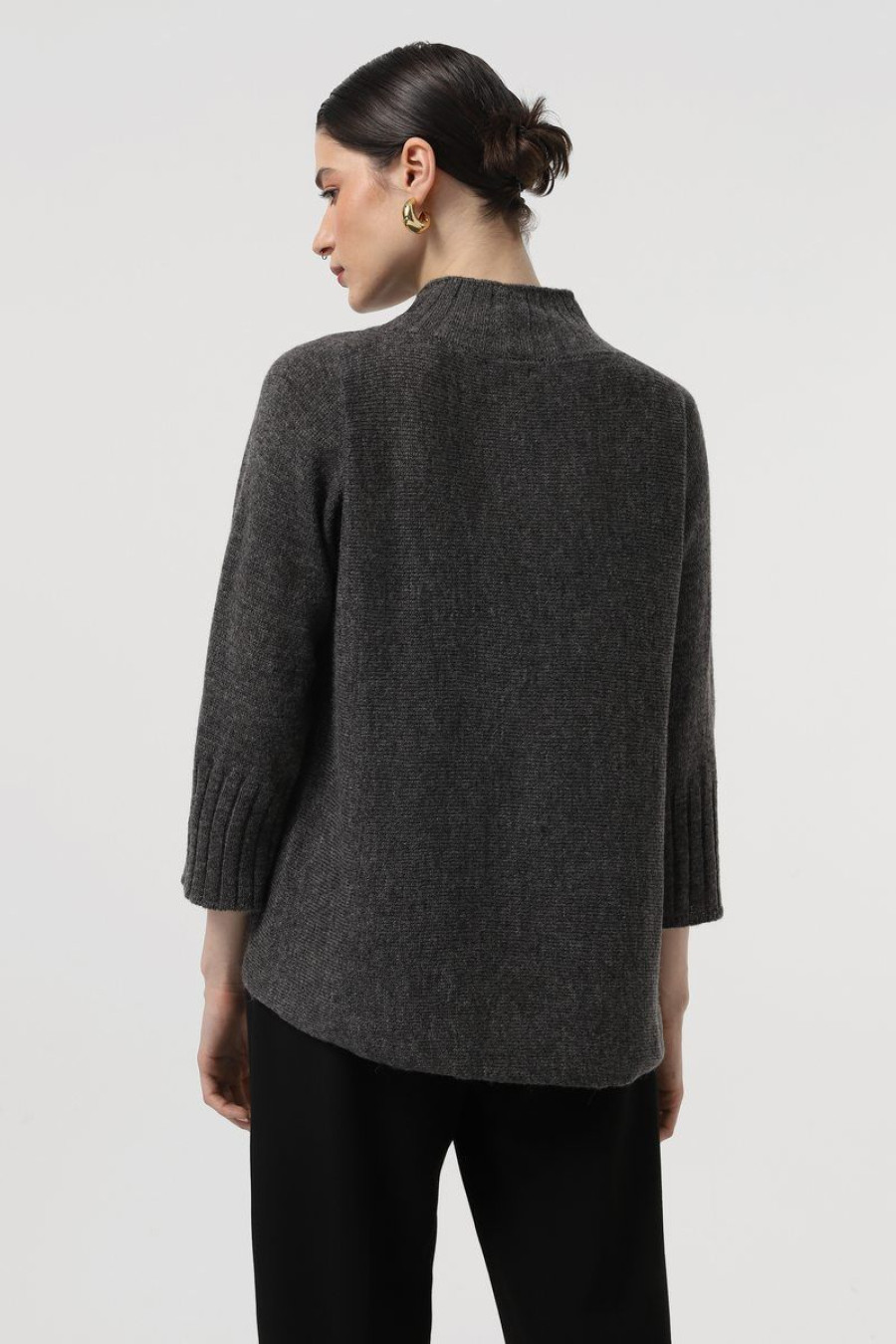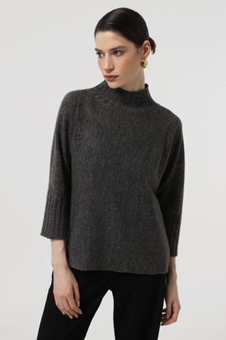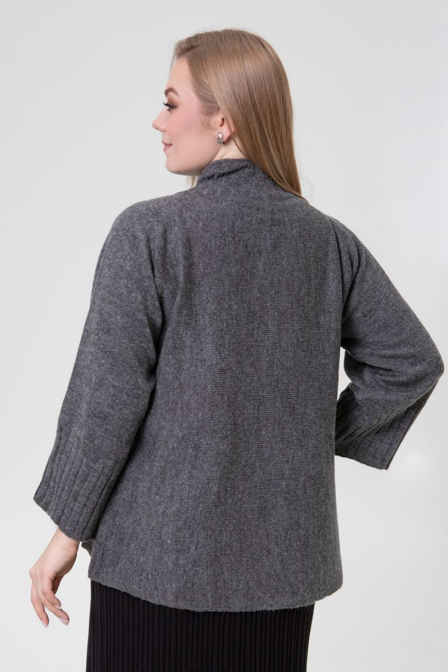 Темно-графитовый вязаный демисезонный джемпер-оверсайз из приятной к телу полушерстяной пряжи с гладким узором-полотном. Модель свободного силуэта с удлиненной спинкой, высоким воротником-резинкой, цельносвязанными просторными рукавами 3/4 с широкими резинками-манжетами, фигурной линией подола. Джемпер подарит ощущение уютного тепла и легкости, подчеркнет женственность и утонченность форм, придаст образу загадочность и шарм. Наряд дополнит повседневный офисный гардероб любой барышни.