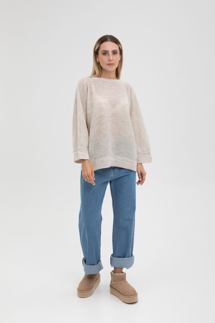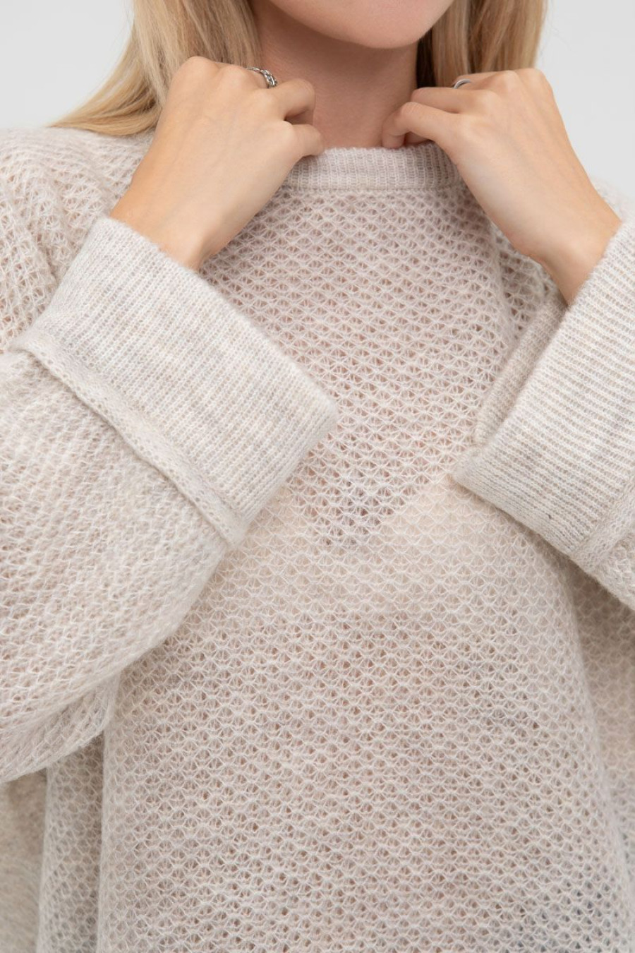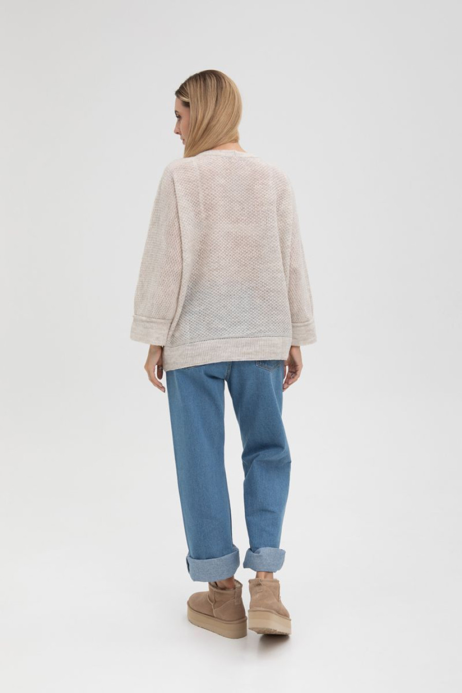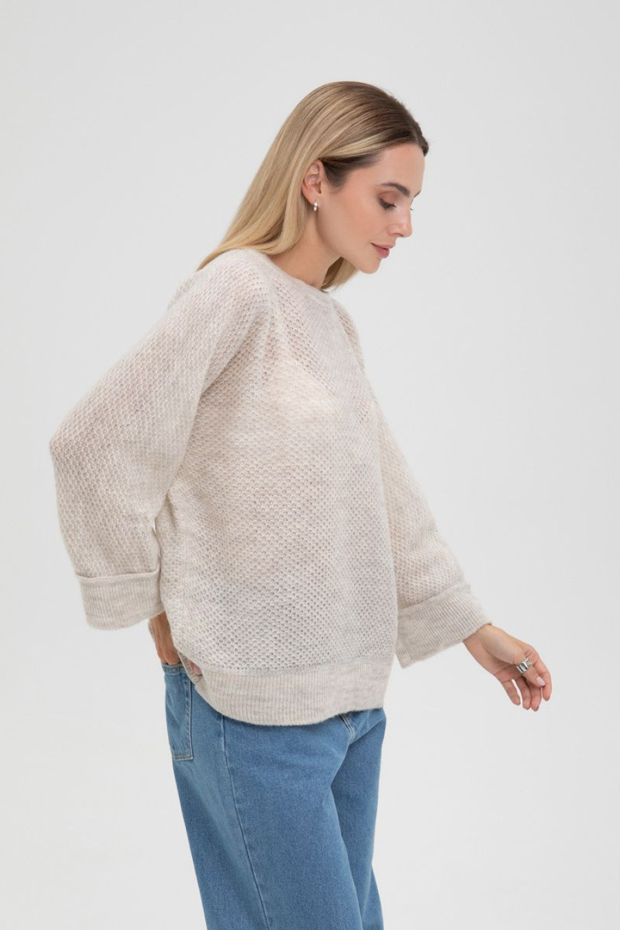 Комфортный жемчужно-серый демисезонный вязаный джемпер-оверсайз из приятной на ощупь полушерстяной пряжи с узором-ячейками, который освежит девичий гардероб. Модель свободного силуэта с округлой горловиной с резинкой-бейкой, цельносвязанными просторными рукавами 3/4 с притачными манжетами-резинками и отрезной манжетой на подоле. Свитер подчеркнет стройность и женственность фигуры, придаст повседневному теплому гардеробу стильность и женственность. Наряд можно дополнить как деловыми офисными брюками или юбкой-карандаш, так и джинсами или леггинсами.