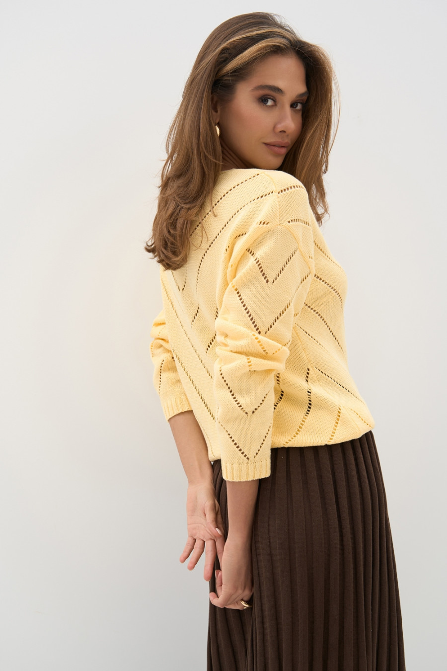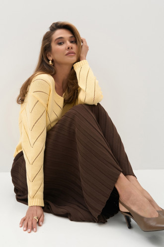 Нежный джемпер из хлопковой пряжи «Элиот» лимонного цвета украшен изящным узором. Модель имеет прямой силуэт, комфортную спущенную линию плеча, V-образную горловину. Изделие можно носить как зимой, так и в межсезонье. Джемпер придаст гардеробу женственности и обаяния, подчеркнет стройность и грациозность фигуры.