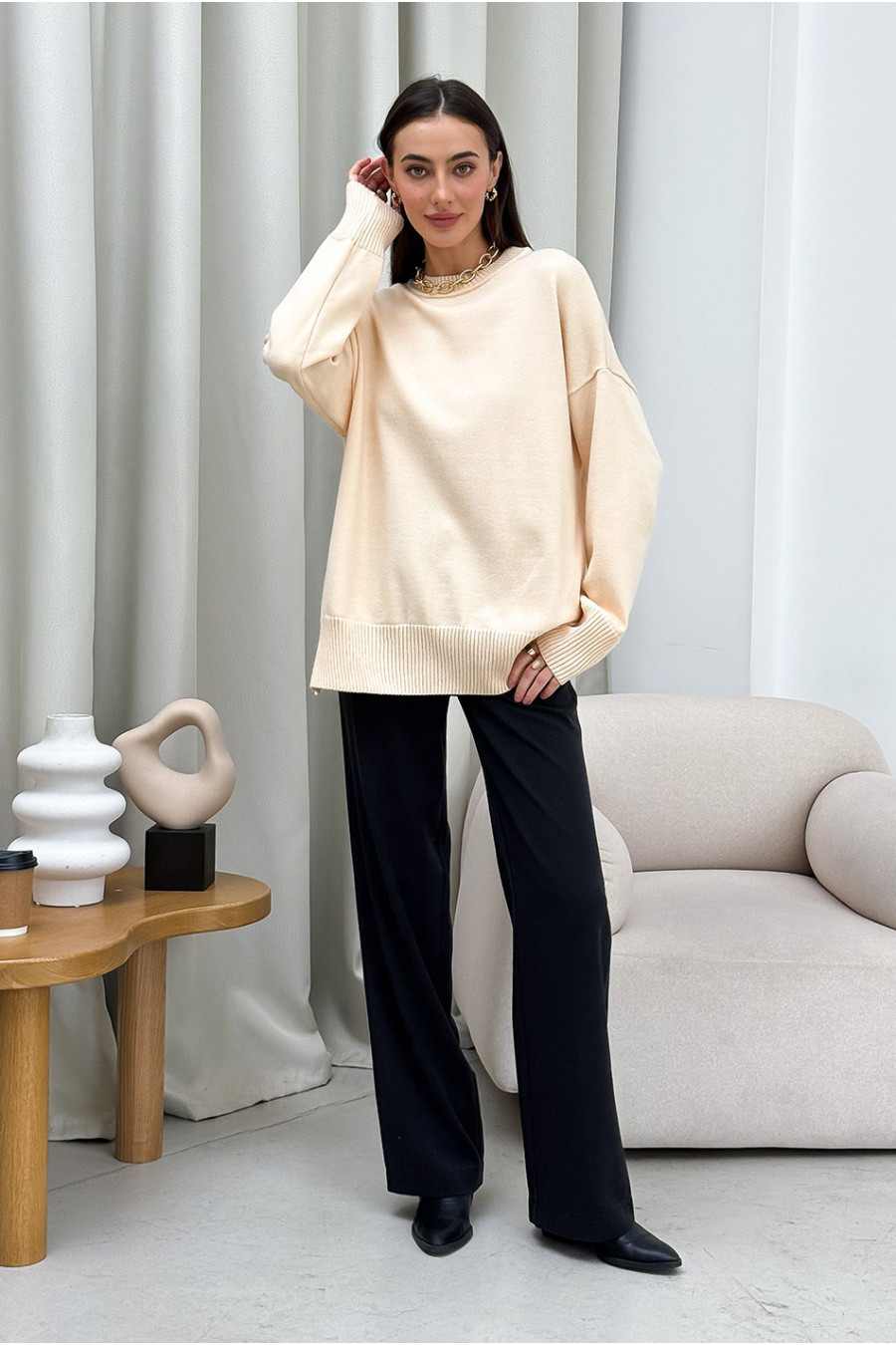 Элегантный удлиненный вязаный джемпер-оверсайз из смессовой теплой пряжи цвета крем-брюле с гладким узором-полотном, который дополнит демисезонный гардероб. Модель свободного силуэта с широкой округлой горловиной с резинкой-бейкой, приспущенной линией плеча, длинными просторными рукавами с высокими манжетами-резинками, манжетой на подоле со шлицами в боковых швах. Джемпер придаст образу стильность и очарование, подчеркнет хрупкость форм. Наряд удачно сочетается как с классическим офисным низом, так и с джинсами или штанами в спортивном стиле.