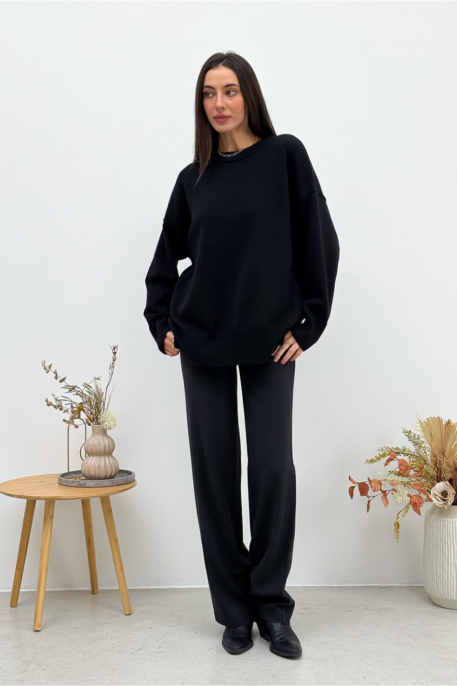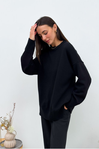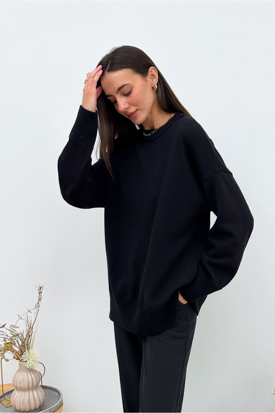 Демисезонный удлиненный вязаный джемпер-оверсайз из смессовой теплой пряжи черного цвета с гладким узором-полотном. Модель свободного силуэта с широкой округлой горловиной с резинкой-бейкой, приспущенной линией плеча, длинными просторными рукавами с высокими манжетами-резинками, манжетой на подоле со шлицами в боковых швах. Джемпер придаст образу стильность и очарование, подчеркнет хрупкость форм. Наряд удачно сочетается как с классическим офисным низом, так и с джинсами или штанами в спортивном стиле.