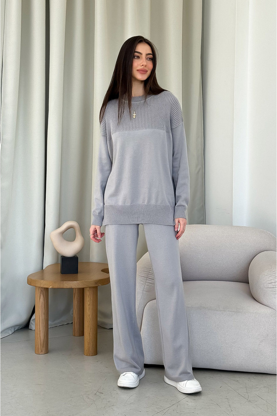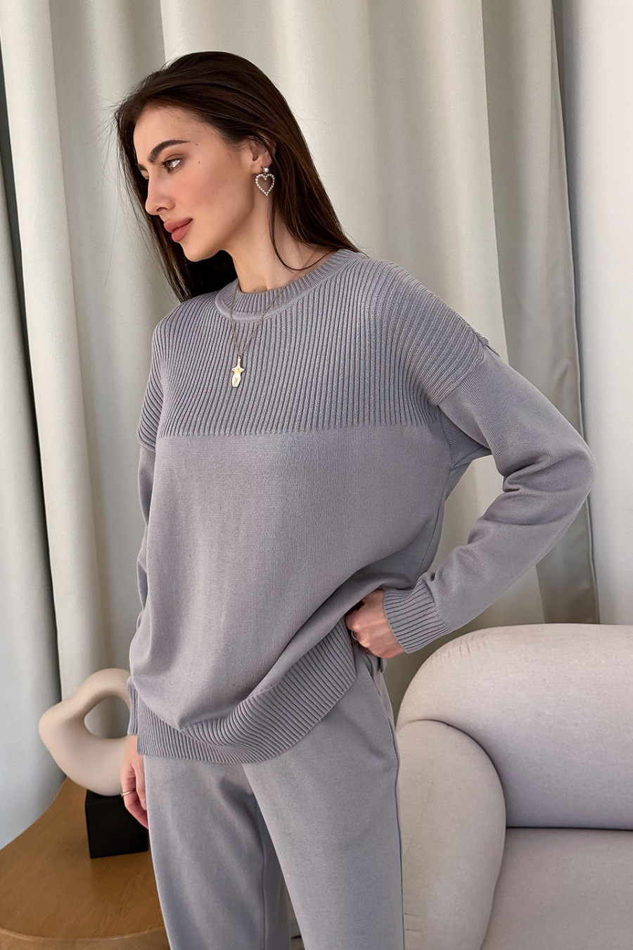 Элегантный вязаный демисезонный джемпер из смессовой хлопковой пряжи серо-стального цвета. Модель свободного силуэта с округлой горловиной с резинкой-бейкой, оригинальной кокеткой-резинкой, приспущенной линией плеча, длинными просторными рукавами с манжетами-резинками, манжетой-резинкой с боковыми шлицами на подоле. Джемпер подчеркнет хрупкость и утонченность форм, придаст образу загадочность и особый шарм. Наряд можно дополнить как юбкой или штанами из одноименной серии, так и деловыми брюками или офисными джинсами.