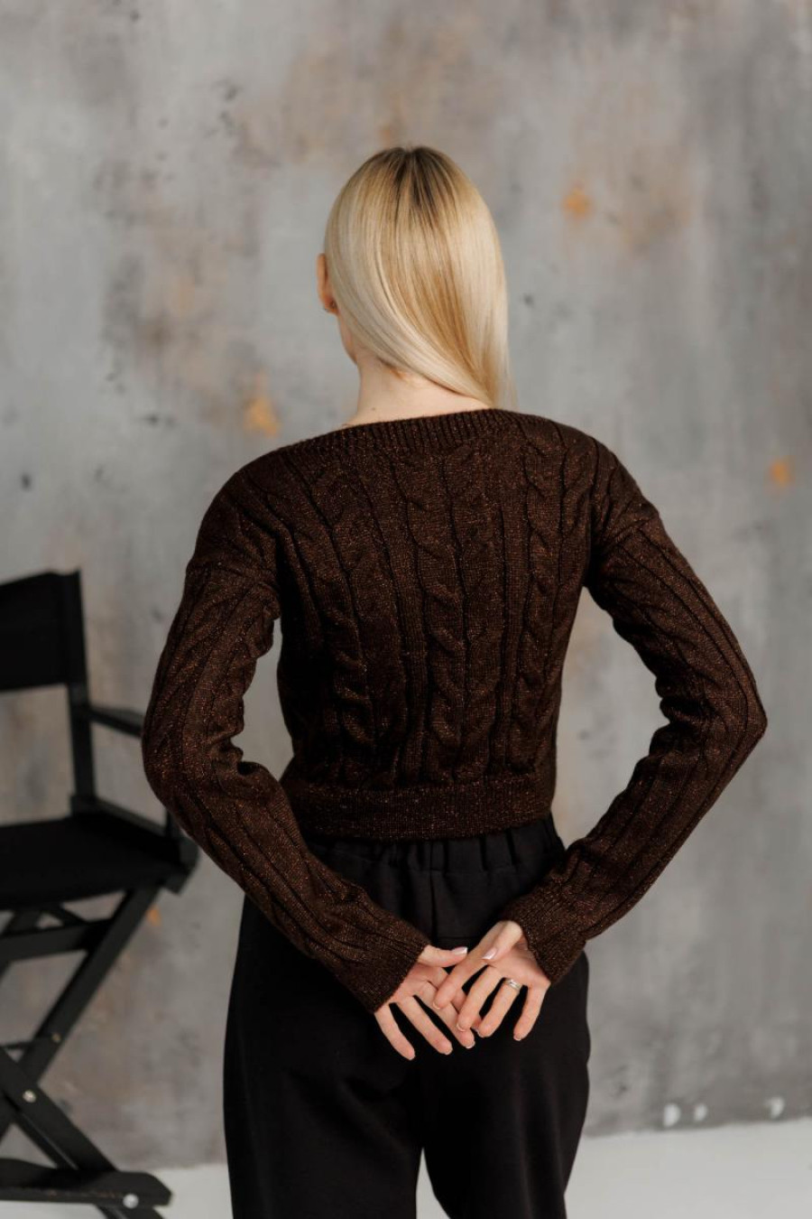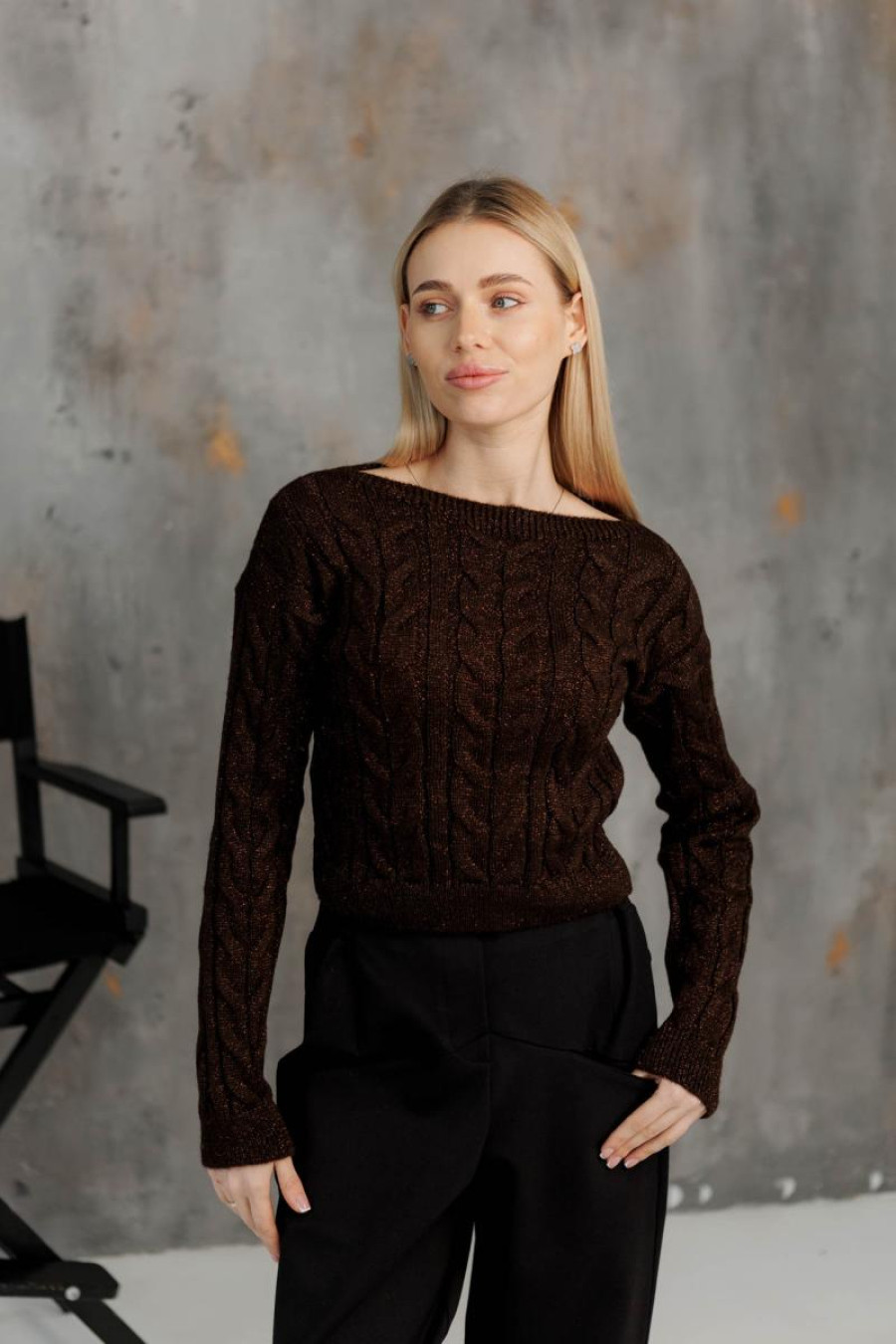 Вязаный кроп-джемпер из смессовой акриловой пряжи с люрексом цвета темного горького шоколада с объемным узором-резинкой. Модель свободного силуэта с горловиной-лодочкой с резинкой-бейкой, приспущенной линией плеча, длинными просторными рукавами с манжетами-резинками и манжетой на подоле. Джемпер подчеркнет хрупкость и грациозность фигуры, придаст образу игривость. Наряд можно сочетать как с брюками с высокой посадкой, так и одеть поверх легкого гольфа или рубашки.