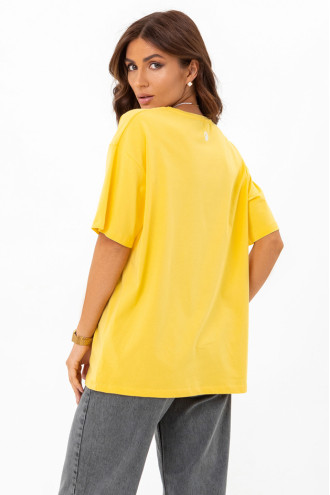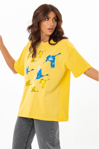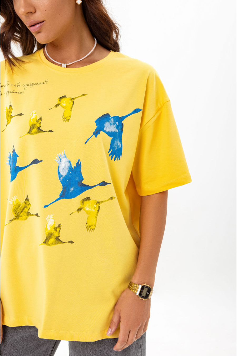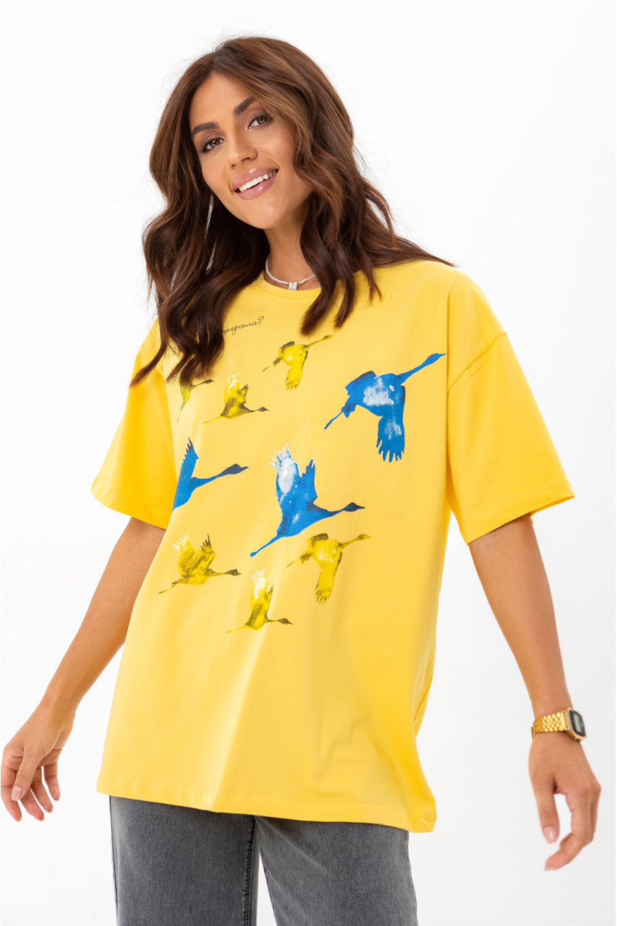 Солнечно-желтая летняя футболка-оверсайз из хлопкового трикотажа с качественным принтом-аистами в желто-голубой гамме, которая будет уместна как в женском, так и в мужском гардеробе. Модель свободного покроя с округлой горловиной, приспущенной линией плеча, просторными короткими рукавами. Футболка дополнит летний образ, подарит ощущение свободы и комфортной легкости. Ее можно сочетать с различными вариантами низа.