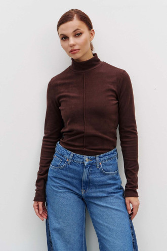 Элегантный трикотажный демисезонный свитшот-гольф из приятной к телу смессовой вискозной ткани шоколадно-кофейного цвета, который придаст образу теплых осенних красок. Модель полуприлегающего силуэта с высоким воротником-стойкой, длинными узкими втачными рукавами без манжет, швом-декором на полочке. Свитшот подчеркнет стройность и грациозность фигуры, придаст образу изысканность и женственность. Наряд будет уместен в повседневном гардеробе любой модницы.
