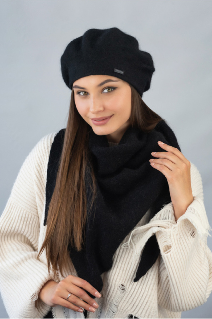 Вязаный теплый женский комплект из пушистой смешанной шерстяной пряжи с хуртом кролика черного цвета. Модель состоит из просторного уютного берета без подкладки с брендированным декором и косынки-шали, которая подарит ощущение тепла. Комплект дополнит повседневный теплый гардероб, придаст образу изысканную элегантность и согреет в холодную пору. Он прекрасно сочетается как с классической демисезонной или зимней верхней одеждой, так и куртками-дутиками или парками.