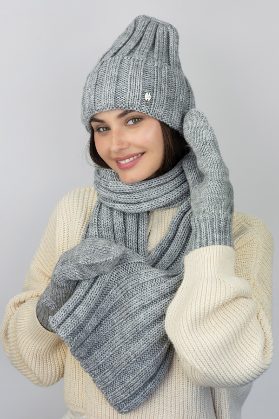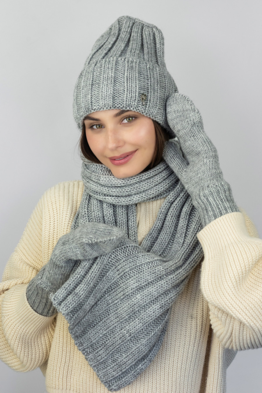 Вязаный зимний женский комплект из меланжевой акриловой пряжи светло-серого цвета с объемным узором-резинкой. Модель состоит из шапки-лопаты с широким отворотом, подкладкой-полоской из микрофлиса, фирменным декором, уютного широкого шарфа средней длины и высоких рукавиц с резинкой-манжетой. Комплект украсит девичий зимний образ, подарит ощущение комфортного тепла в холодную пору. Он прекрасно сочетается как с верхней одеждой в классическом стиле, так и со спортивными моделями.