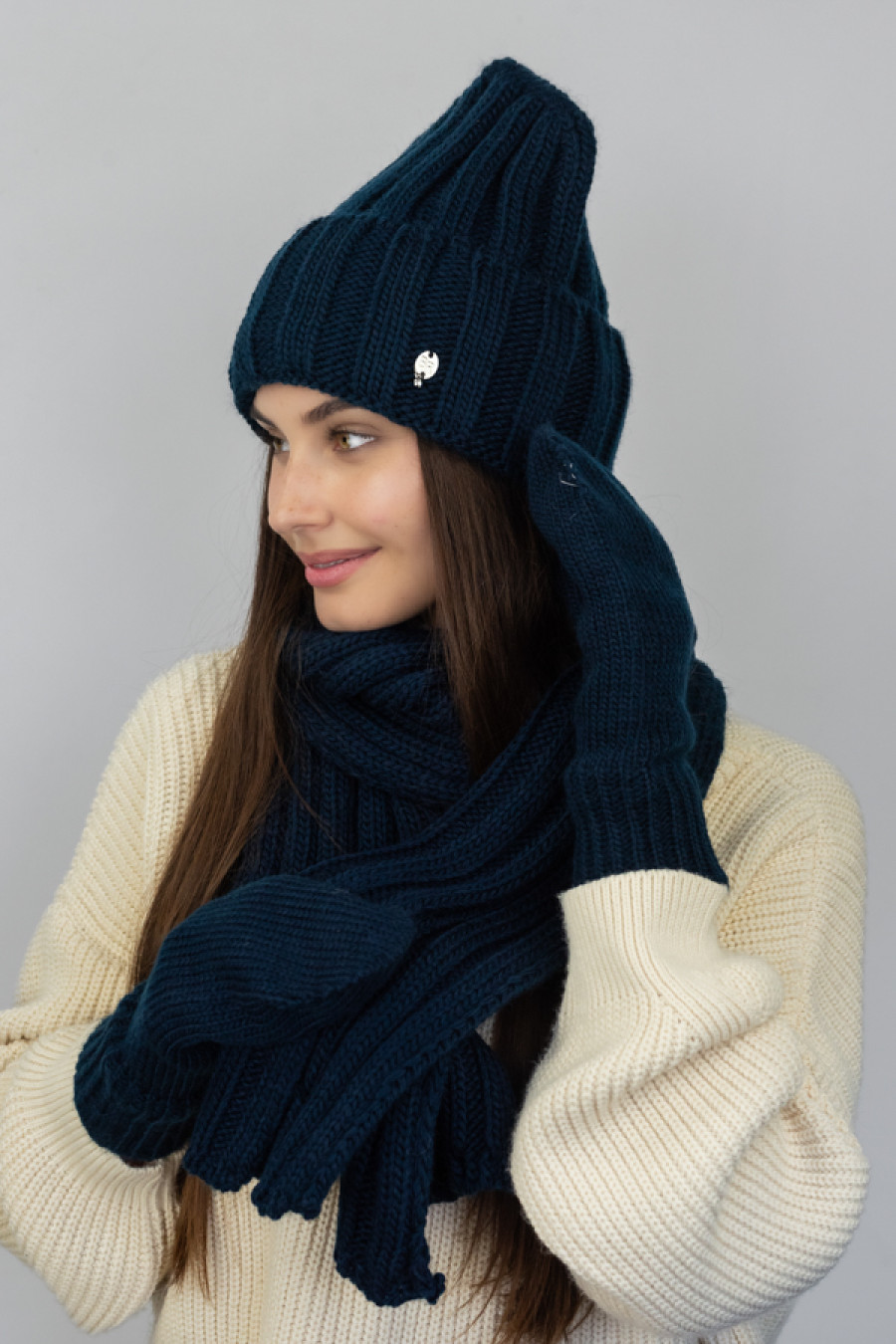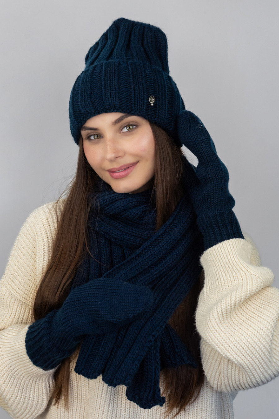 Элегантный зимний женский вязаный комплект из акриловой пряжи цвета темно-синего джинса с объемным узором-резинкой. Модель состоит из шапки-лопаты с широким отворотом, подкладкой-полоской из микрофлиса, фирменным декором, уютного широкого шарфа средней длины и высоких рукавиц с резинкой-манжетой. Комплект украсит девичий зимний образ, подарит ощущение комфортного тепла в холодную пору. Он прекрасно сочетается как с верхней одеждой в классическом стиле, так и со спортивными моделями.