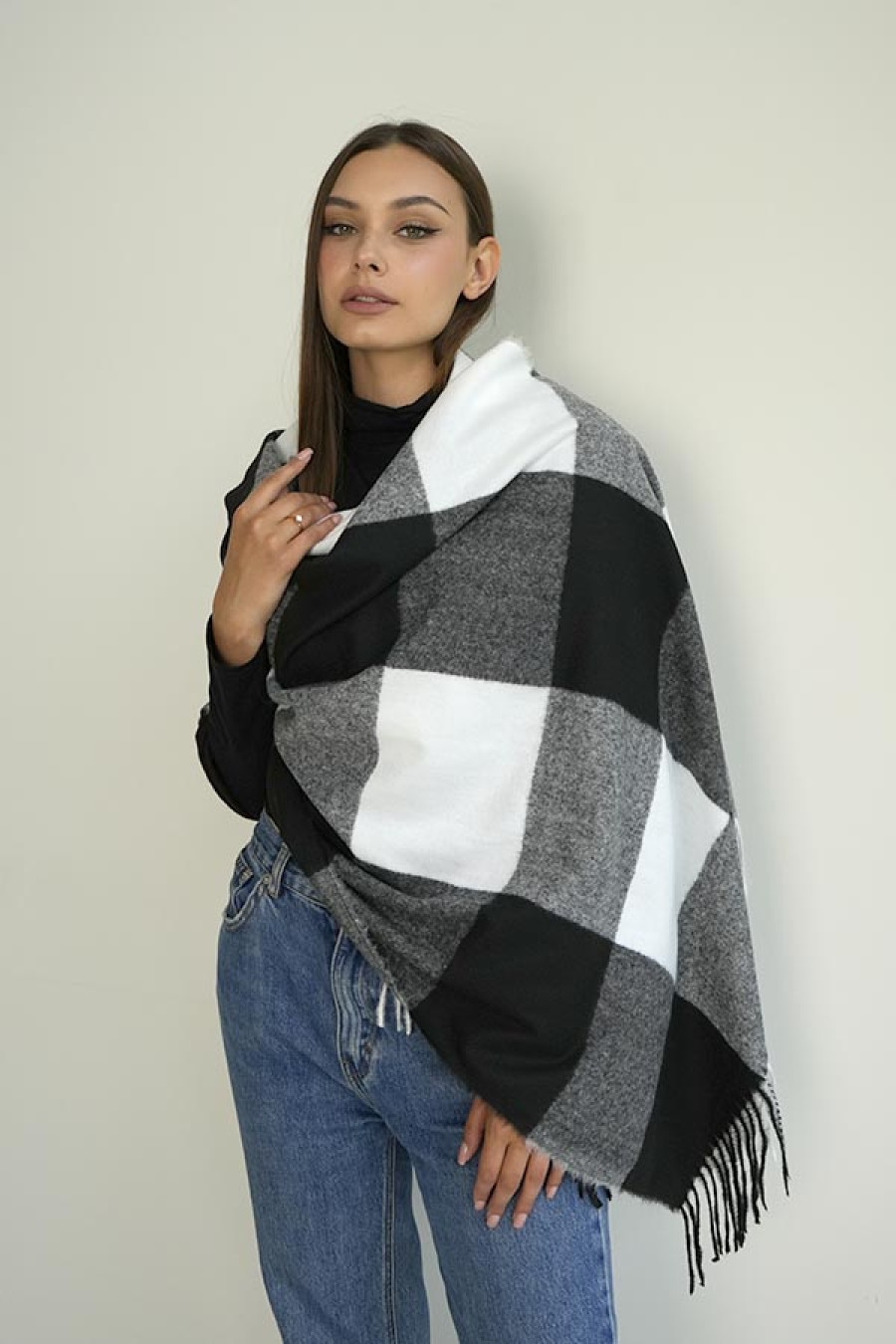 Большой мягкий палантин в клетку, выполненный в приятных оттенках – черного и белого цвета. Ткань выглядит легкой, мягкой и теплой, с кашемировой структурой. По краям – аккуратная бахрома, придающая шарму и уюту. Палантин прекрасно сочетается с пальто, платьем или свитером, создавая элегантный, женственный образ.