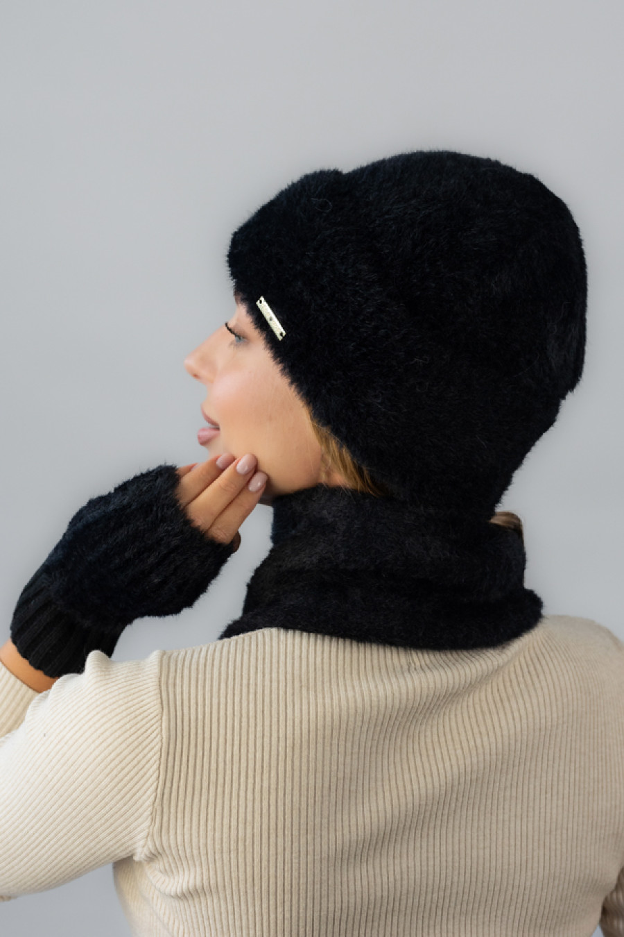 Часто задаваемые вопросы к товару Комплект «Аурелия» (шапка, шарф и митенки) черного цвета: