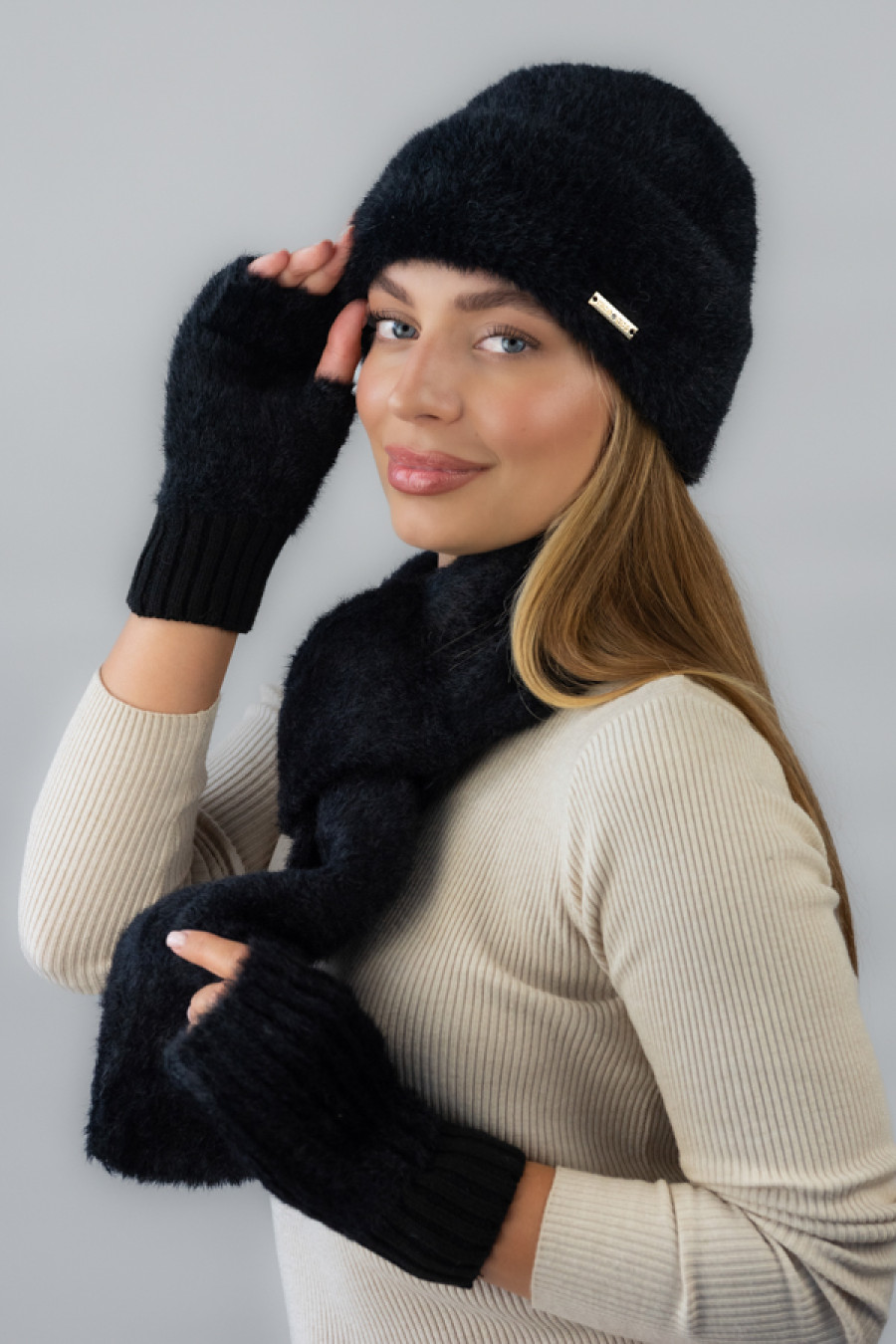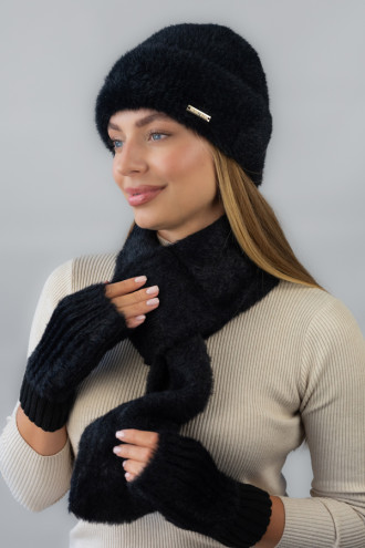 Очаровательный теплый вязаный комплект черного цвета из мягкой пушистой пряжи с добавлением мохера и коттона, который придаст образу романтичности и нежности. Модель состоит из шапки, шарфа и митенок, которые согреют ваши руки даже в сильные холода. Мягкая фактура пряжи дарит комфорт, а лаконичный дизайн подчеркнет женственность.