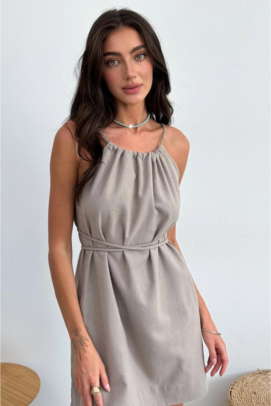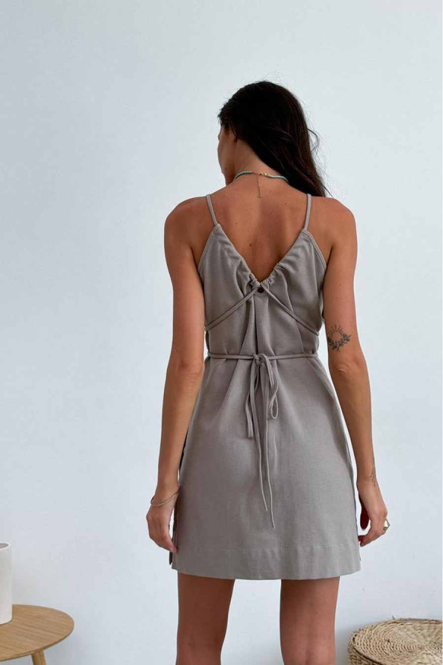 Легкое хлопковое платье длины мини, выполненное в свободном, непринужденном крое, что дарит комфорт и естественную легкость в движении. Верх оформлен на бретельках и имеет мягкую сборку по линии декольте, создающей деликатный объем. Главный акцент – спинка: глубокий V-образный вырез дополнен завязкой, где бретели переходят в пояс и формируют изящный узел. Низ модели мягко расширяется вниз, формируя легкий трапециевидный крой. Благодаря сочетанию минимализма и продуманных деталей платье выглядит женственно, легко и современно – идеальный вариант для летних образов.
