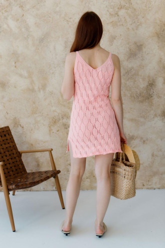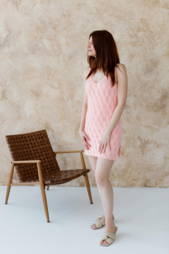 Ажурное вязаное платье длиной мини на тонких бретельках выглядит легко и изящно, подчеркивая фигуру благодаря деликатному узору. Викдритая фактура придает образу воздушности и текстурности, а короткая длина делает его более игривым. Боковой разрез придает подвижность и легкий акцент на ногах, придавая силуэту динамики и женственности. Модель выполнена на подложке, что обеспечивает комфорт, сохраняя при этом воздушность ажура. Идеальный вариант для пожилых образов с ноткой романтики и непринужденной элегантности.