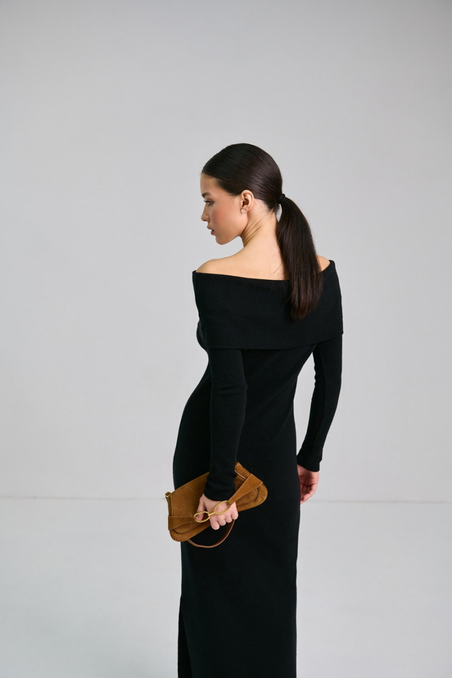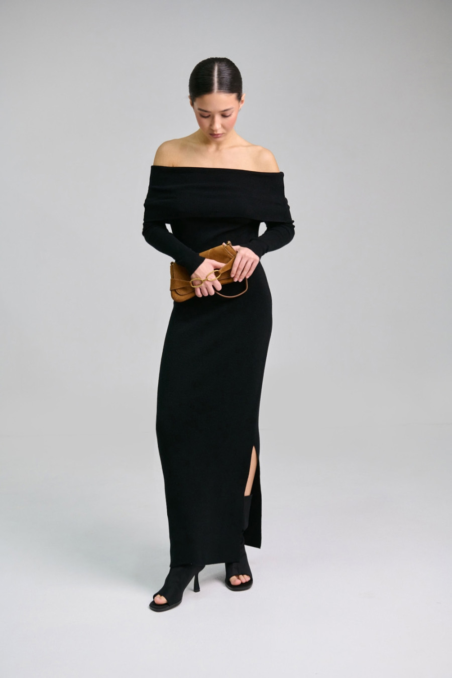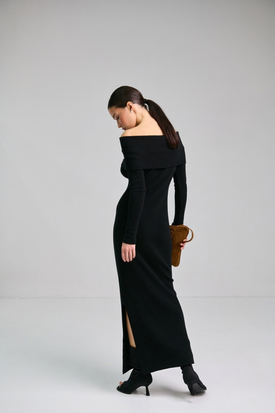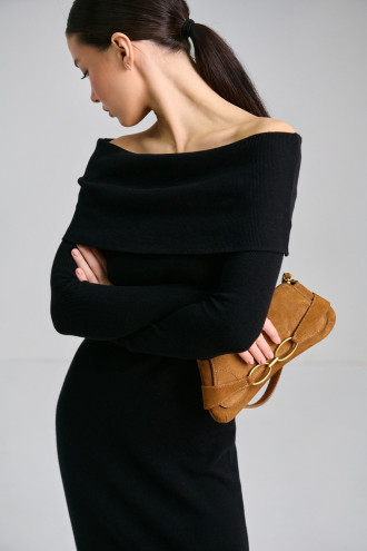 Платье-чулок с открытыми плечами «Наргес» черного цвета изготовлено из пряжи из натуральных волокон и некоторым процентом эластичных. Благодаря этому она приятна на ощупь, мягкая, хорошо тянется и комфортно прилегает к телу. Широкий эластичный манжет на линии груди открывает плечи и драпируется на любой фасон. Рукав длинный, втачной. Внизу платья слева расположен разрез до колена. Платье "Наргес" подчеркивает женственность и загадочность.
