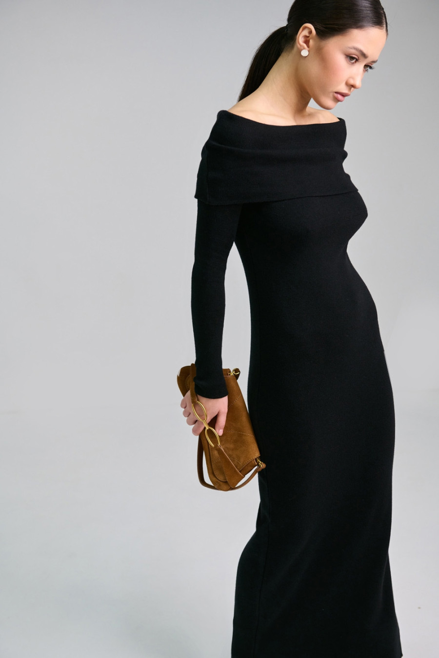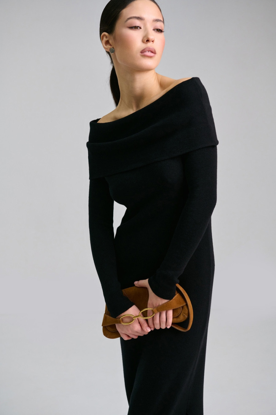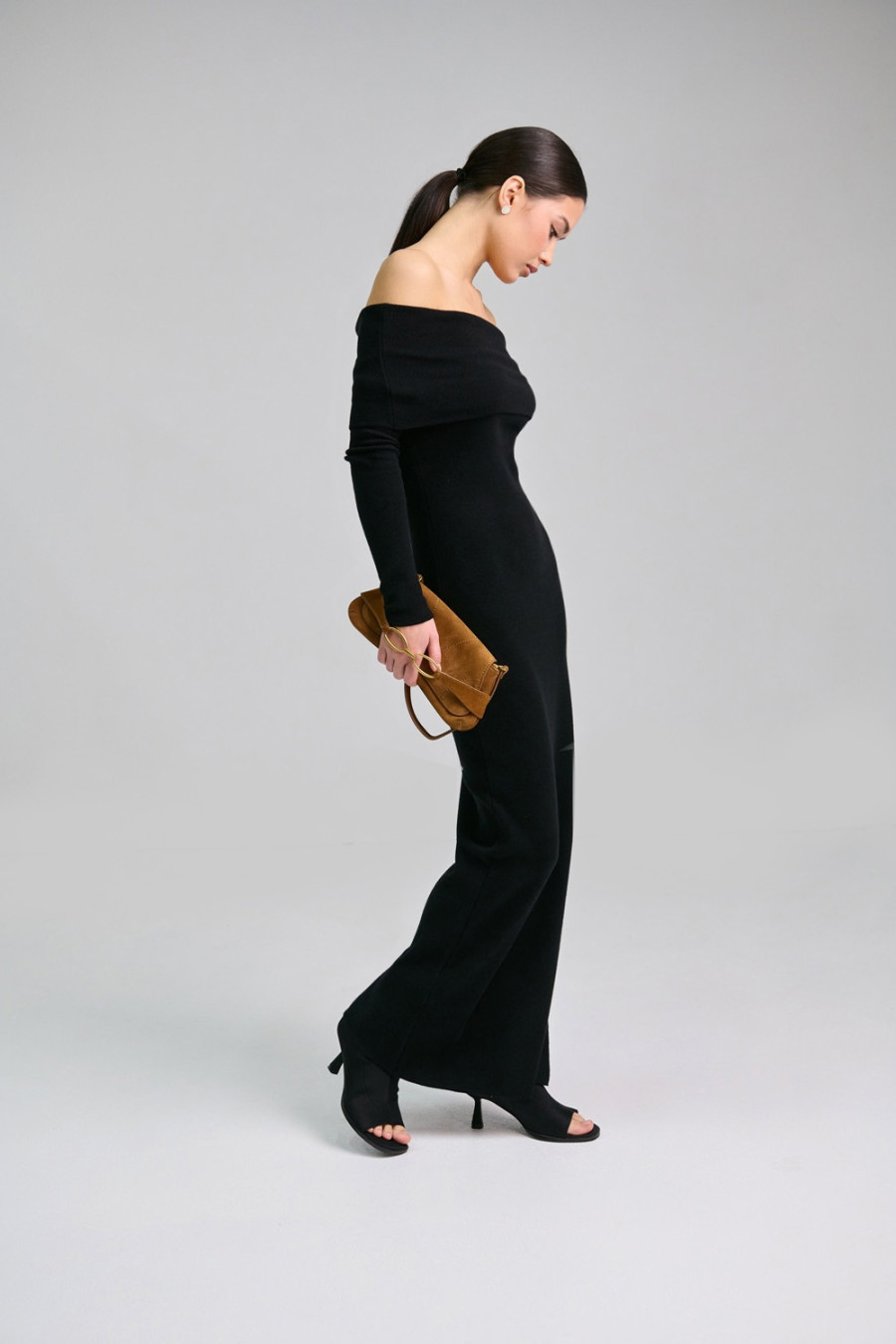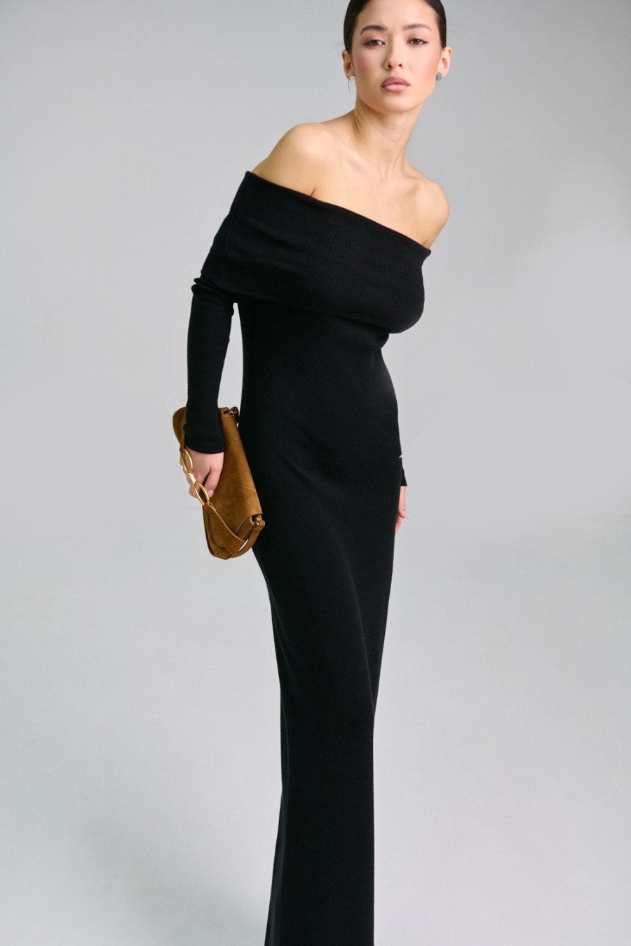 Платье-чулок с открытыми плечами «Наргес» черного цвета изготовлено из пряжи из натуральных волокон и некоторым процентом эластичных. Благодаря этому она приятна на ощупь, мягкая, хорошо тянется и комфортно прилегает к телу. Широкий эластичный манжет на линии груди открывает плечи и драпируется на любой фасон. Рукав длинный, втачной. Внизу платья слева расположен разрез до колена. Платье "Наргес" подчеркивает женственность и загадочность.