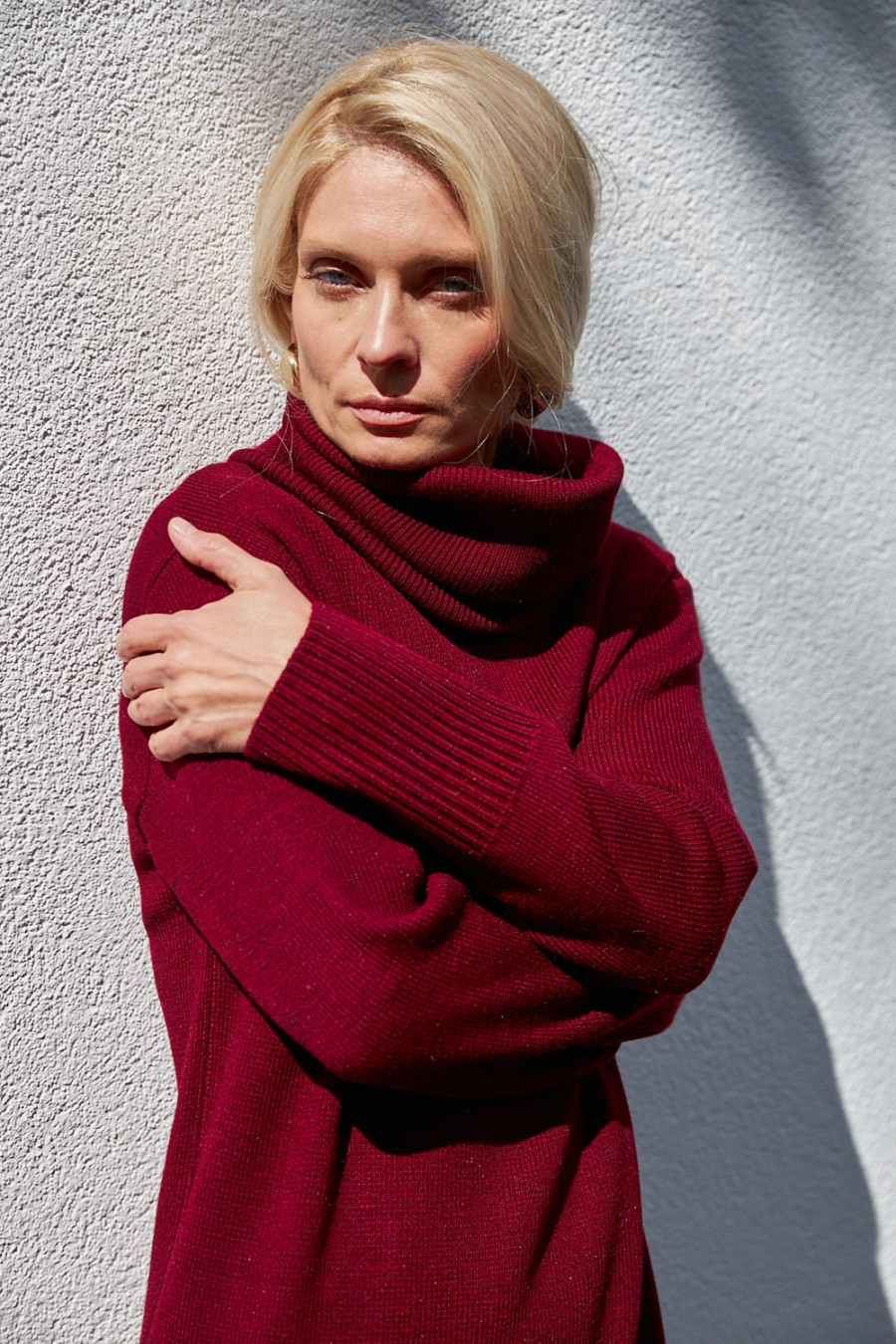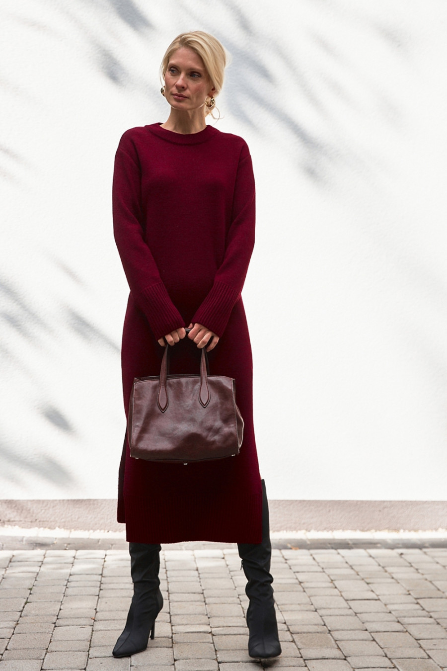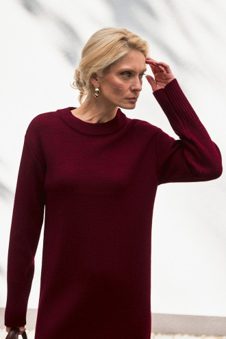 Бордово-винное длинное платье из смессовой теплой меланжевой пряжи, которое придаст образу сочных осенних красок. Модель свободного силуэта с высоким съемным воротником-хомут, приспущенной линией плеча, длинными просторными рукавами с высокими манжетами-резинками и широкой манжетой на подоле, глубокими шлицами в боковых швах. Платье подчеркнет стройность и грациозность фигуры, придаст образу женственность и изысканность. Наряд дополнит гардероб любой барышни и прекрасно сочетается с разнообразными аксессуарами.