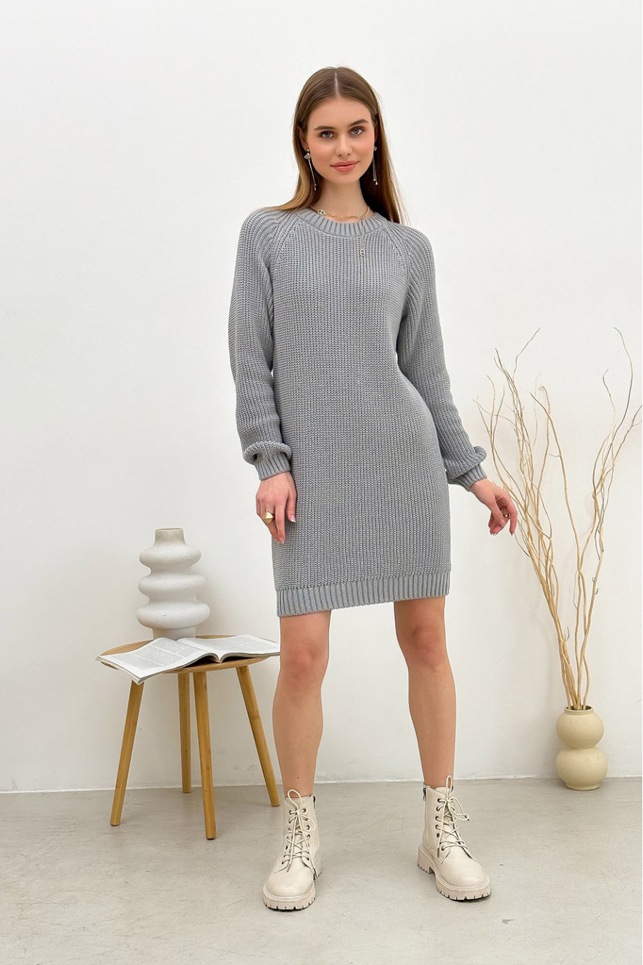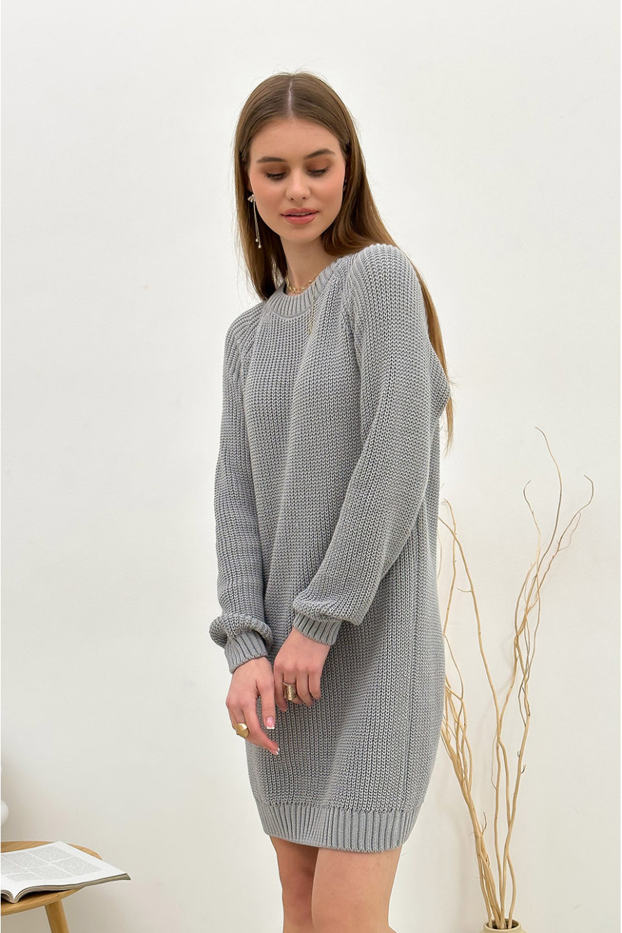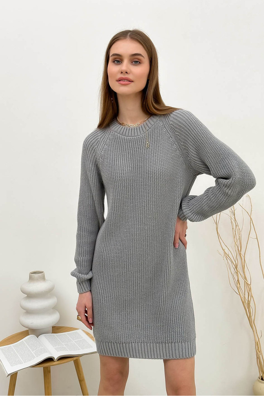 Серо-стальное короткое вязаное платье-туника из приятной к телу натуральной хлопковой пряжи с узором-резинкой, которое придаст демисезонному образу сдержанность и загадочность. Модель полуприлегающего фасона с округлой горловиной с резинкой-бейкой, длинными просторными рукавами-реглан с манжетами-резинками и манжетой на подоле. Платье подчеркнет стройность и женственность фигуры, придаст повседневному образу стильность и шарм. Наряд будет уместен и для офиса, и для деловой встречи. При желании его можно сочетать с джинсами-скини или леггинсами.