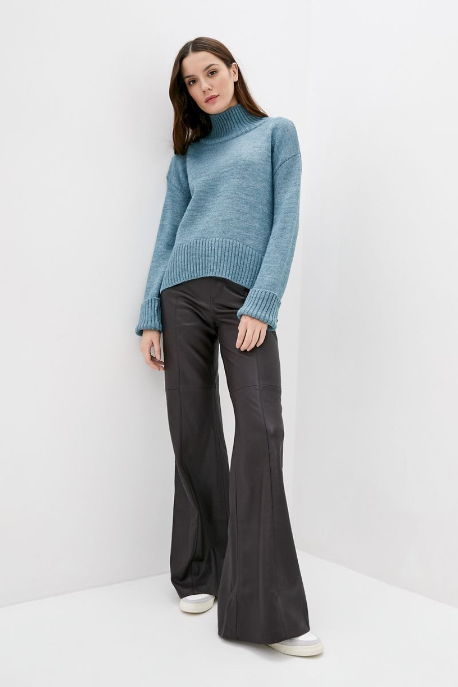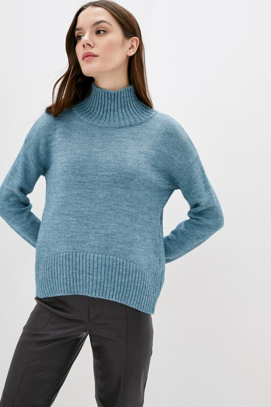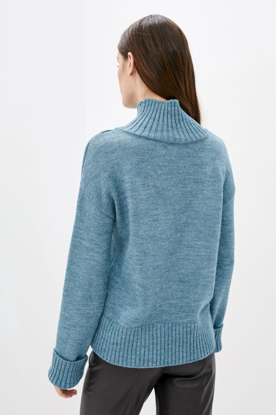 Серо-голубой стильный вязаный демисезонный свитер из приятной к телу полушерстяной пряжи с гладким узором, который дополнит гардероб любой модницы. Модель свободного силуэта с высоким уютным воротником-стойкой, приспущенной линией плеча, длинными просторными рукавами с манжетами-резинками и манжетой на подоле. Свитер согреет в зимнюю пору, подчеркнет женственность и грациозность фигуры. Наряд можно сочетать как с классическим гардеробом, так и с кэжуал моделями.
