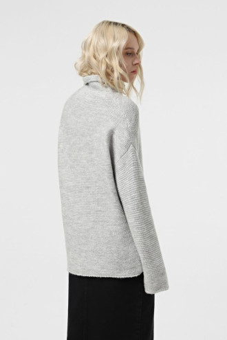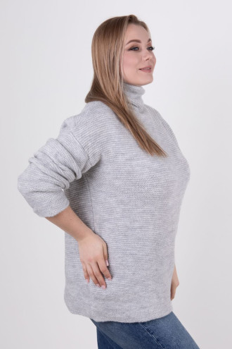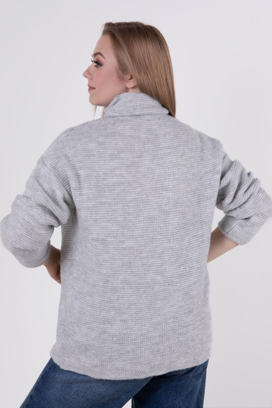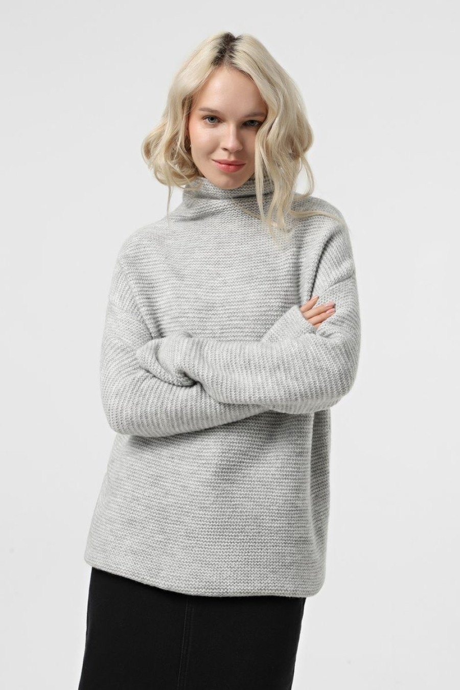 Элегантный вязаный демисезонный свитер из приятной к телу смессовой шерстяной меланжевой пряжи светло-серого цвета с фактурным узором. Модель свободного фасона с удлиненной спинкой, высоким уютным воротником-стойкой с отворотом, приспущенной линией плеча, длинными просторными рукавами с манжетами-руликами и узкой манжетой на подоле, шлицами в боковых швах. Свитер подчеркнет хрупкость и стройность форм, придаст образу стильность и сдержанность. Наряд удачно сочетается и с деловым офисным низом, и с джинсами или штанами в спортивном стиле.