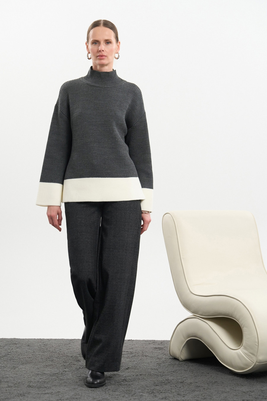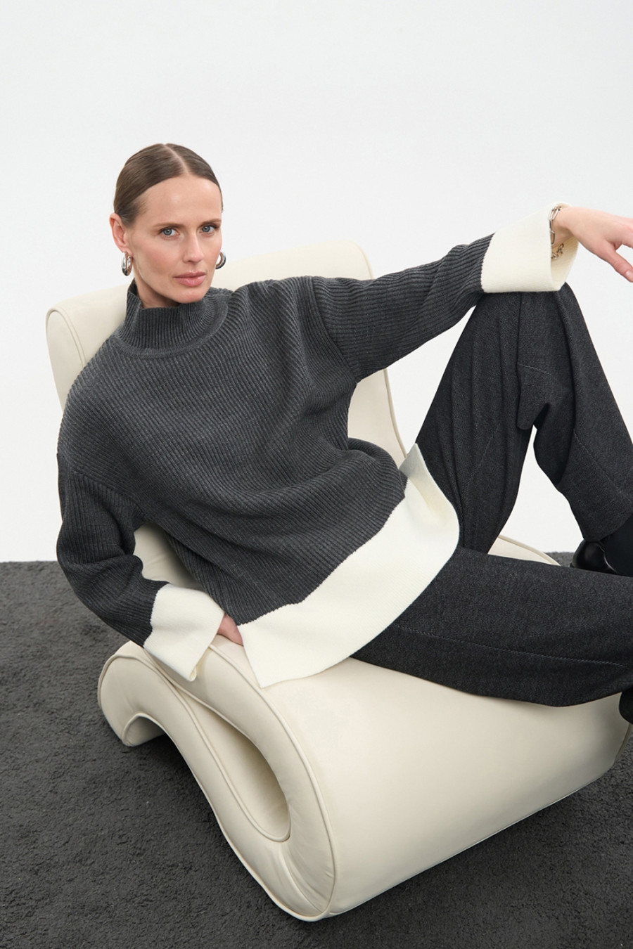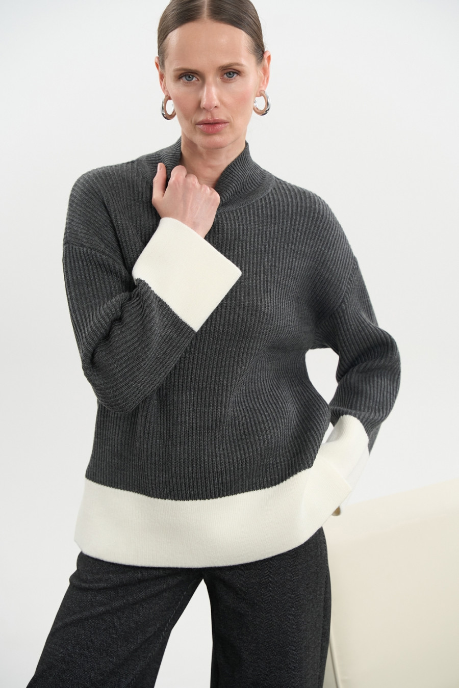 Свитер "Вислава" темно-серого цвета с контрастными белыми деталями изготовлен из пряжи с включением шерсти и вискозы. Силуэт – прямой широкий. Рукав тоже прямой, имеет удлиненное плечо. Горловина – высокая стойка комфортной ширины. Фактура изделия – гладкое плетение. Сбоку свитера предусмотрены разрезы. Особенность модели – это акцент на манжетах и низа за счет снежно-белого цвета.