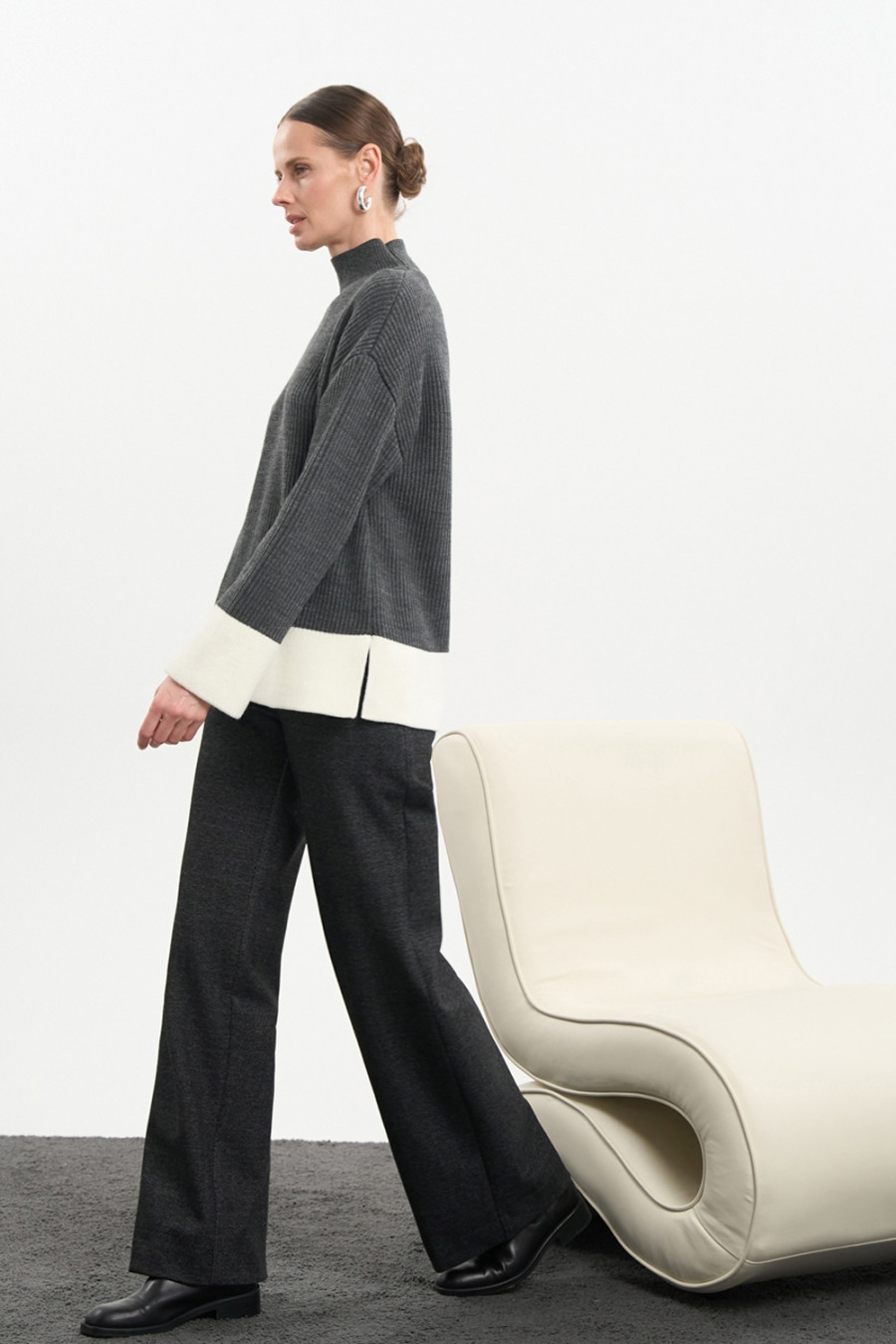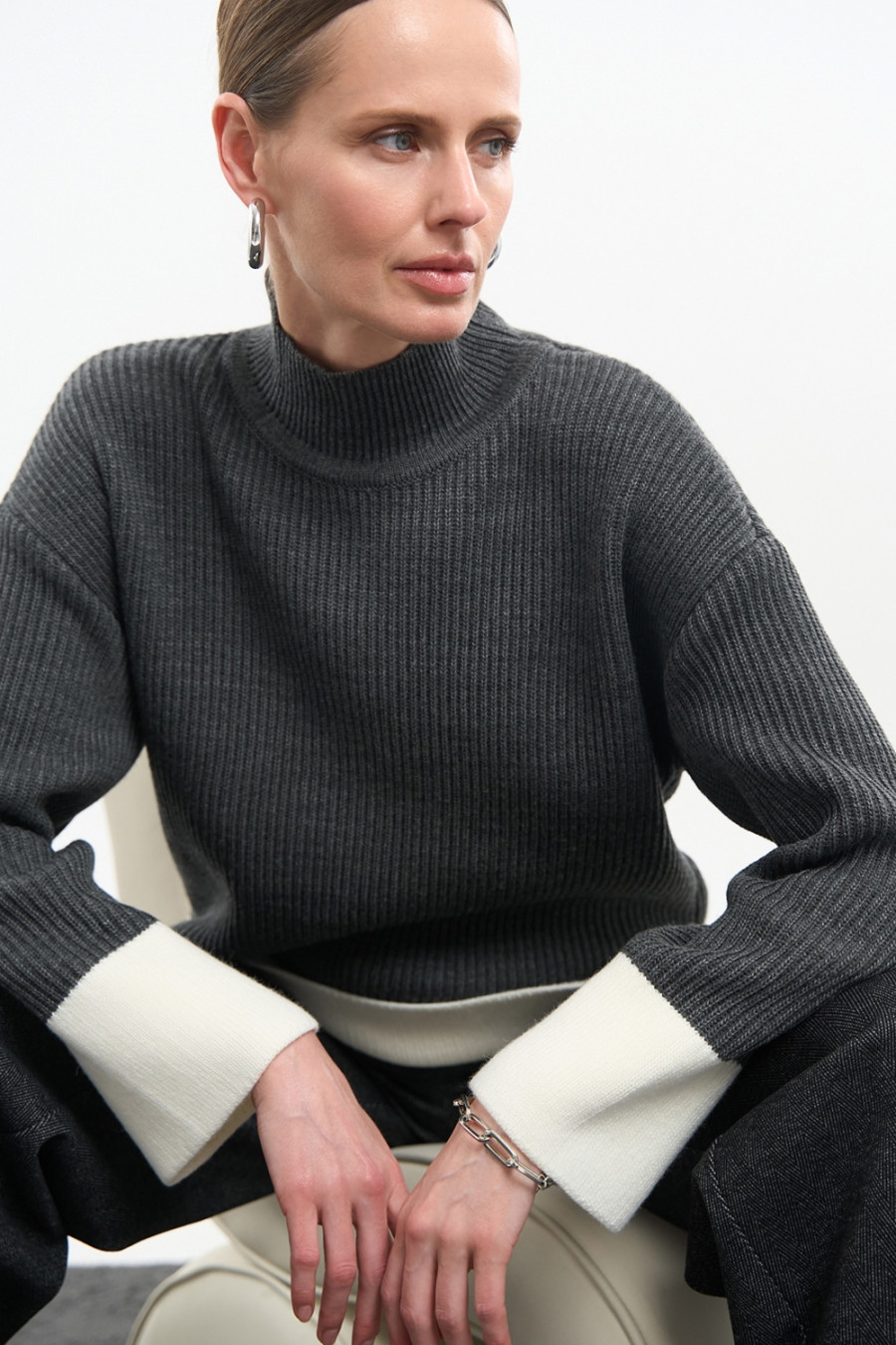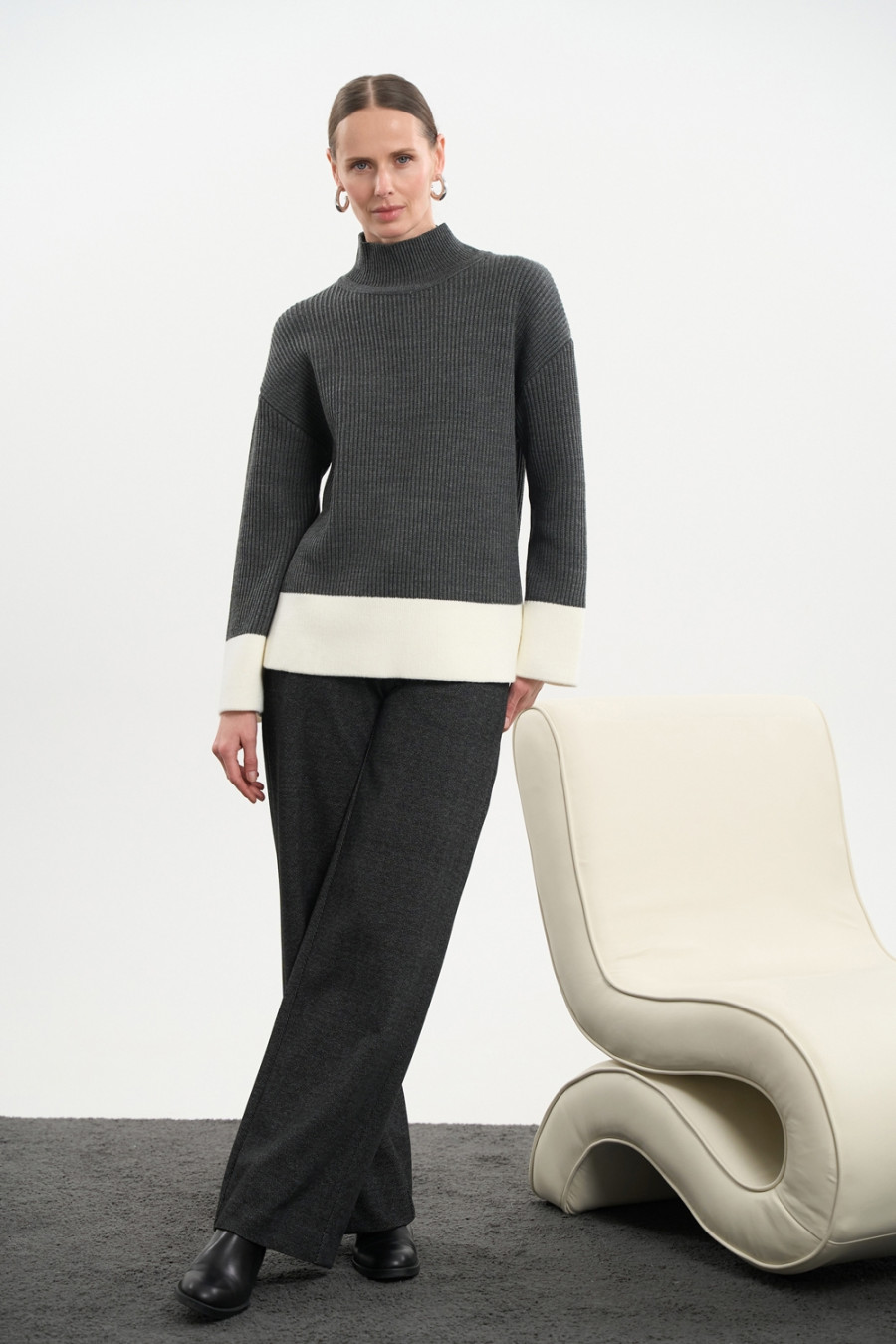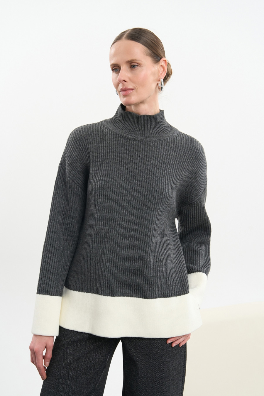 Свитер "Вислава" темно-серого цвета с контрастными белыми деталями изготовлен из пряжи с включением шерсти и вискозы. Силуэт – прямой широкий. Рукав тоже прямой, имеет удлиненное плечо. Горловина – высокая стойка комфортной ширины. Фактура изделия – гладкое плетение. Сбоку свитера предусмотрены разрезы. Особенность модели – это акцент на манжетах и низа за счет снежно-белого цвета.