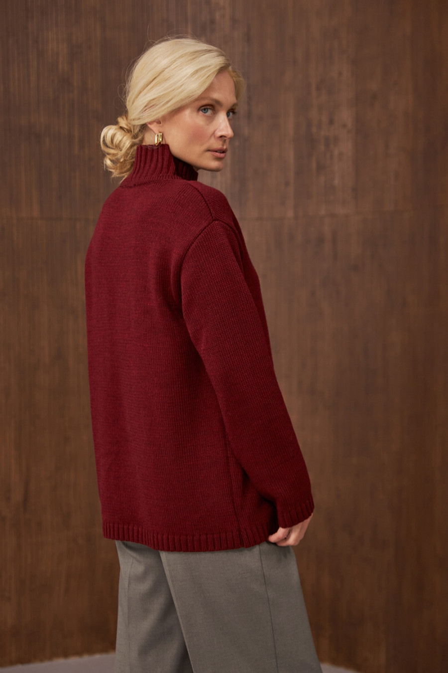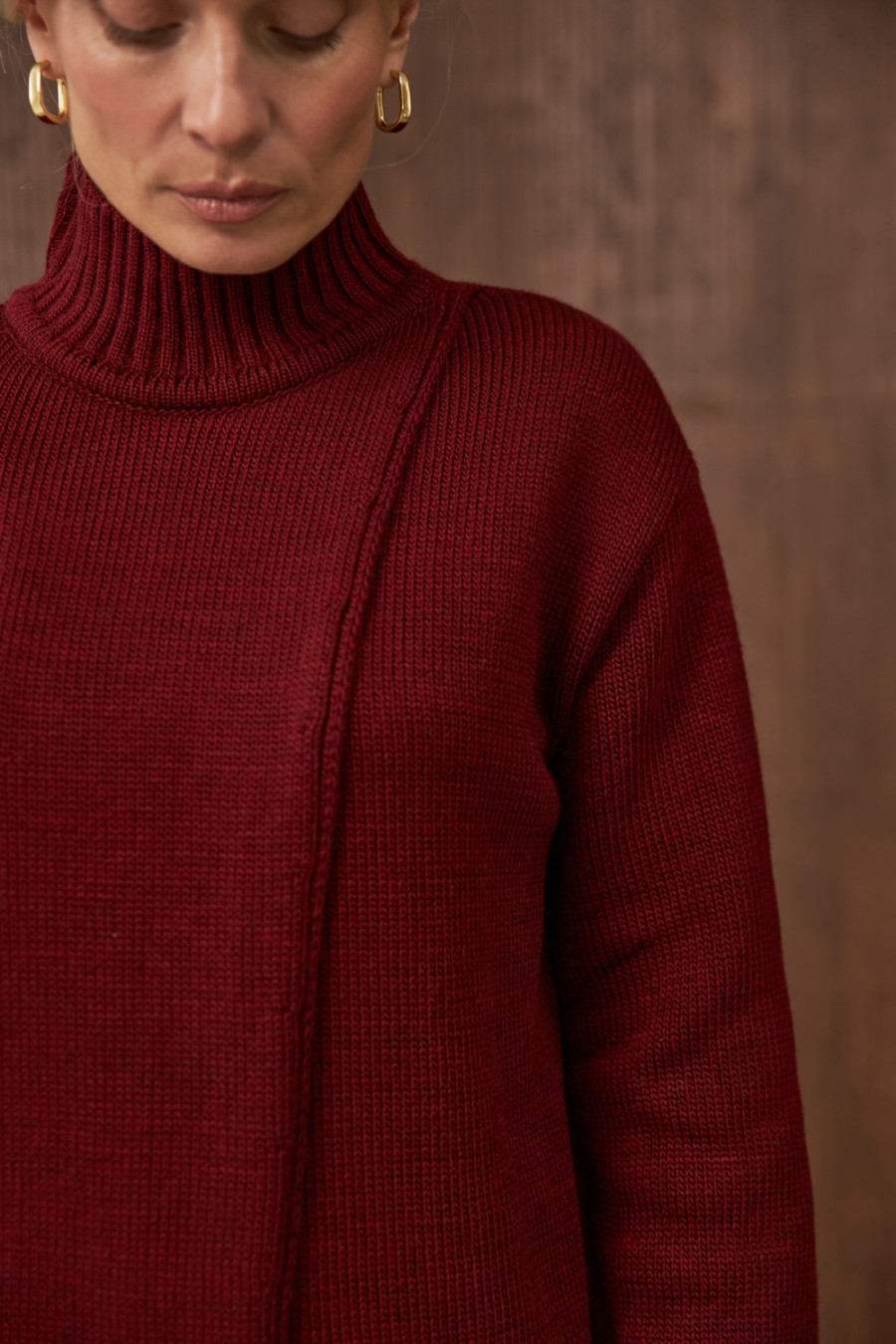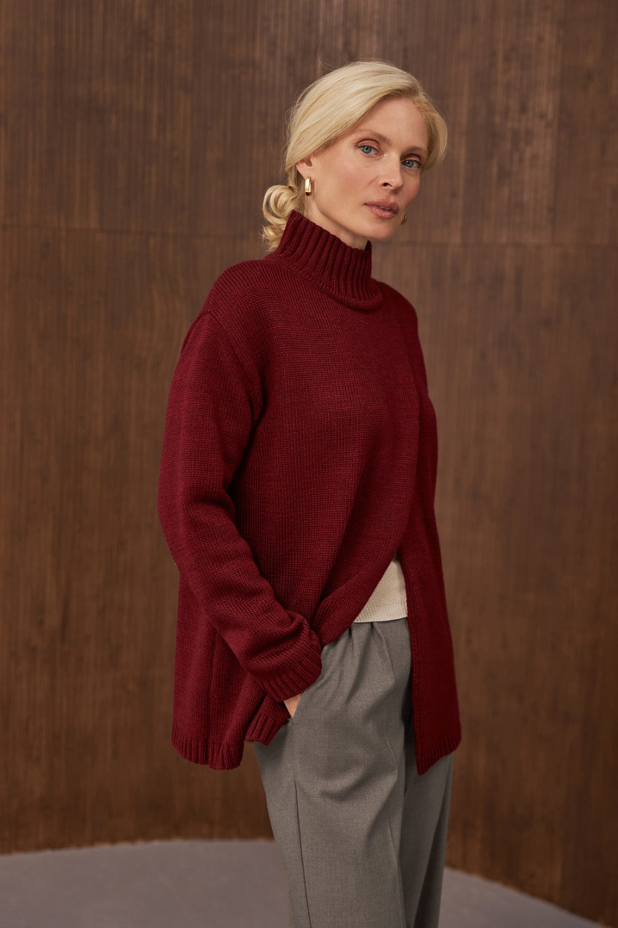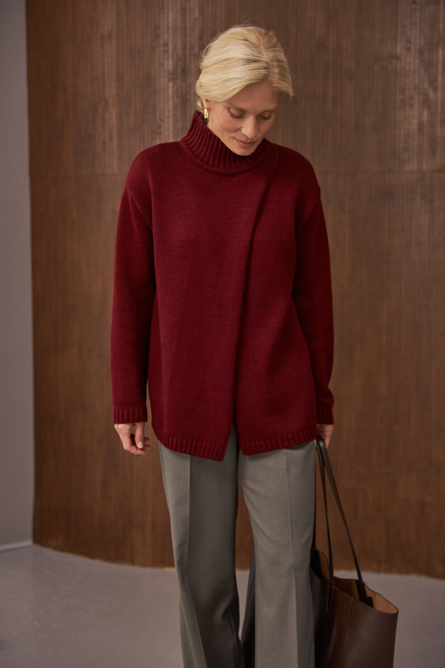 Свитер на запах «Майбах» насыщенного вишневого цвета изготовлен техникой стабильного переплета средней плотности. Для этого использована полушерстяная пряжа. Силуэт – прямой, свободного кроя. Имитация запаха расположена слева. При движении полы низа расходятся, слегка открывая линию бедер. Воротник-стойка мягко окутывает шею. Рукав – втачный, со спущенной линией плеча и немощными манжетами, сплетенными «резинкой».