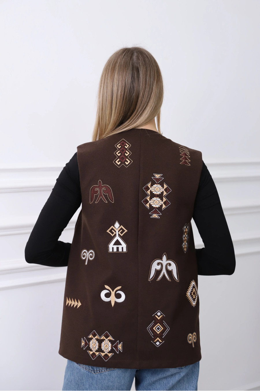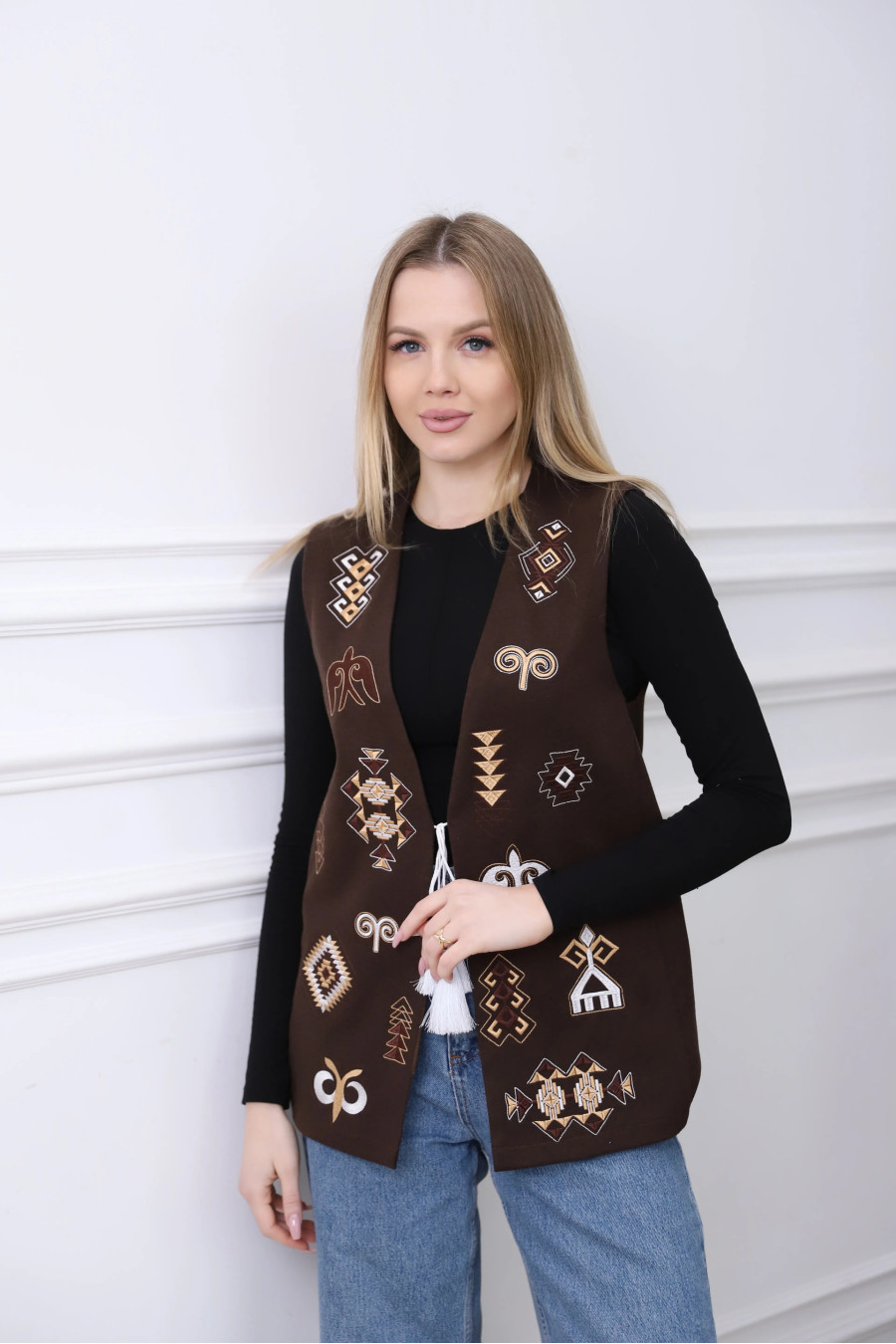 Жилетка «Берестянка» выполнена в сдержанном и в то же время выразительном стиле. Модель прямого силуэта без застежек с V-образным вырезом создает легкий и утонченный силуэт и гармонично дополняет образ. По всей поверхности изделия размещены декоративные этнические мотивы, выполненные в технике гладь. Жилетка легко сочетается с базовыми вещами – гольфами, рубашками или лонгсливами, создавая современный образ с нотками этнического стиля.