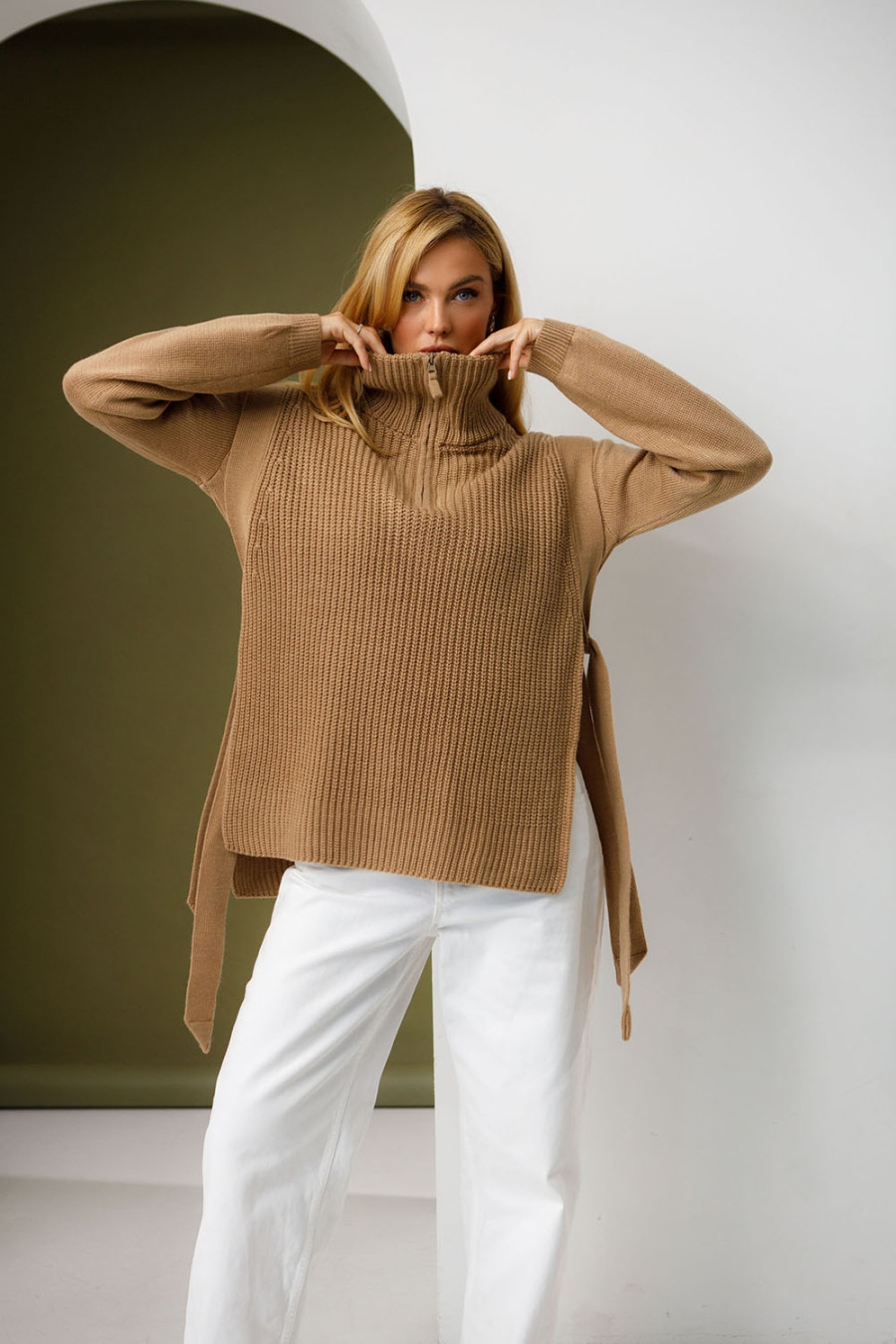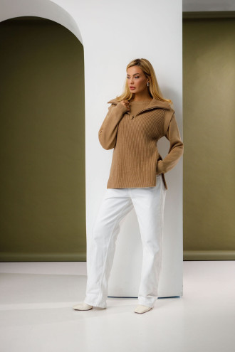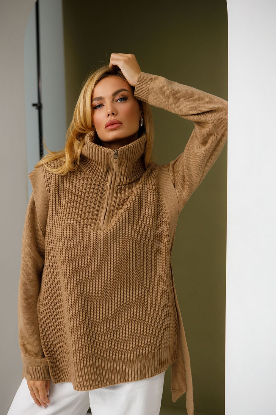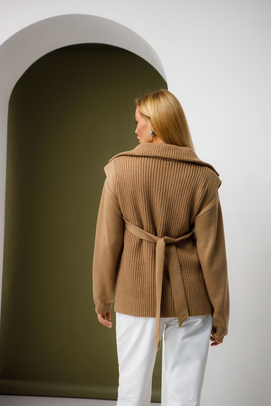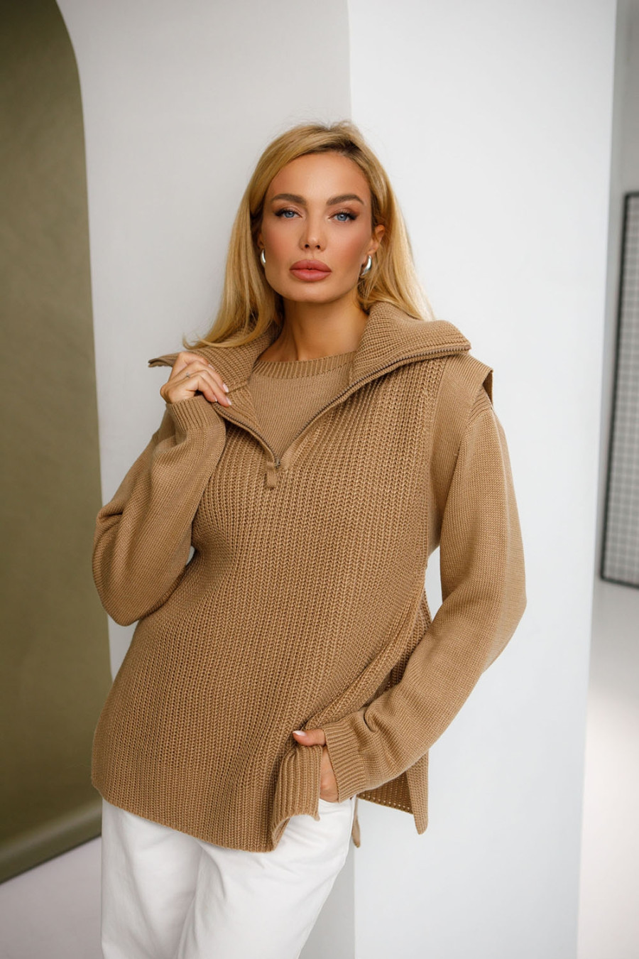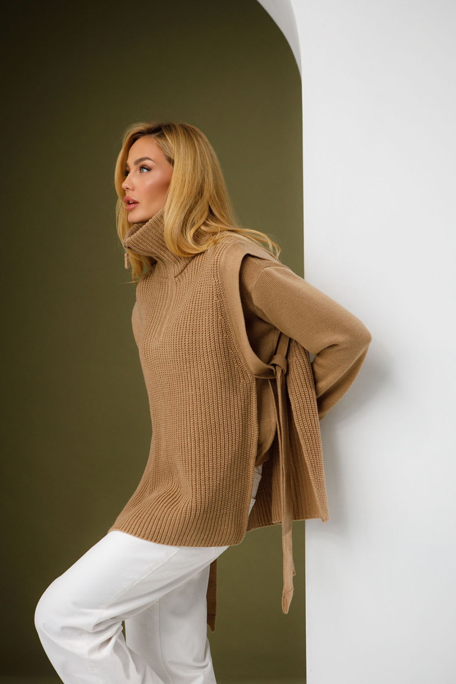 Жилет «Элис» песочного цвета сплетенный из полушерстяной пряжи с добавлением вискозы. Поэтому он приятен на ощупь, теплый, легкий и не мнется. Фактура – эластичное плетение с узкими вертикальными полосками. Силуэт – свободный, прямой. Воротник на молнии может быть как отложным, так и стойкой, закрывающей шею до подбородка. Благодаря этой опции шарф можно не надевать. Бока жилета открыты. Фиксируются они бейками-поясом, являющимися одновременно и окантовкой плечевых срезов. Изделие имеет один универсальный размер.