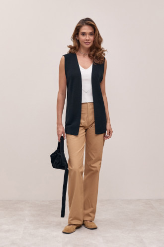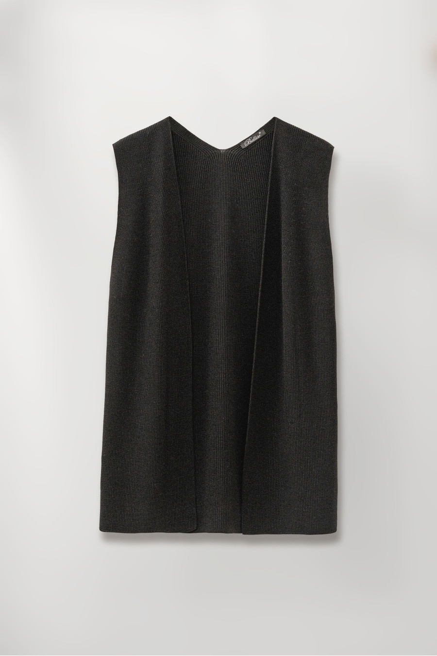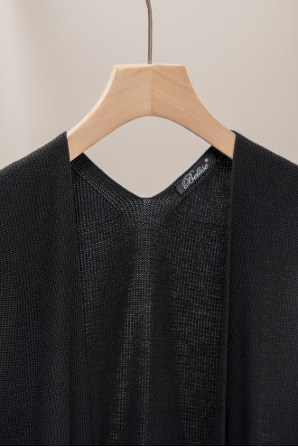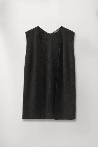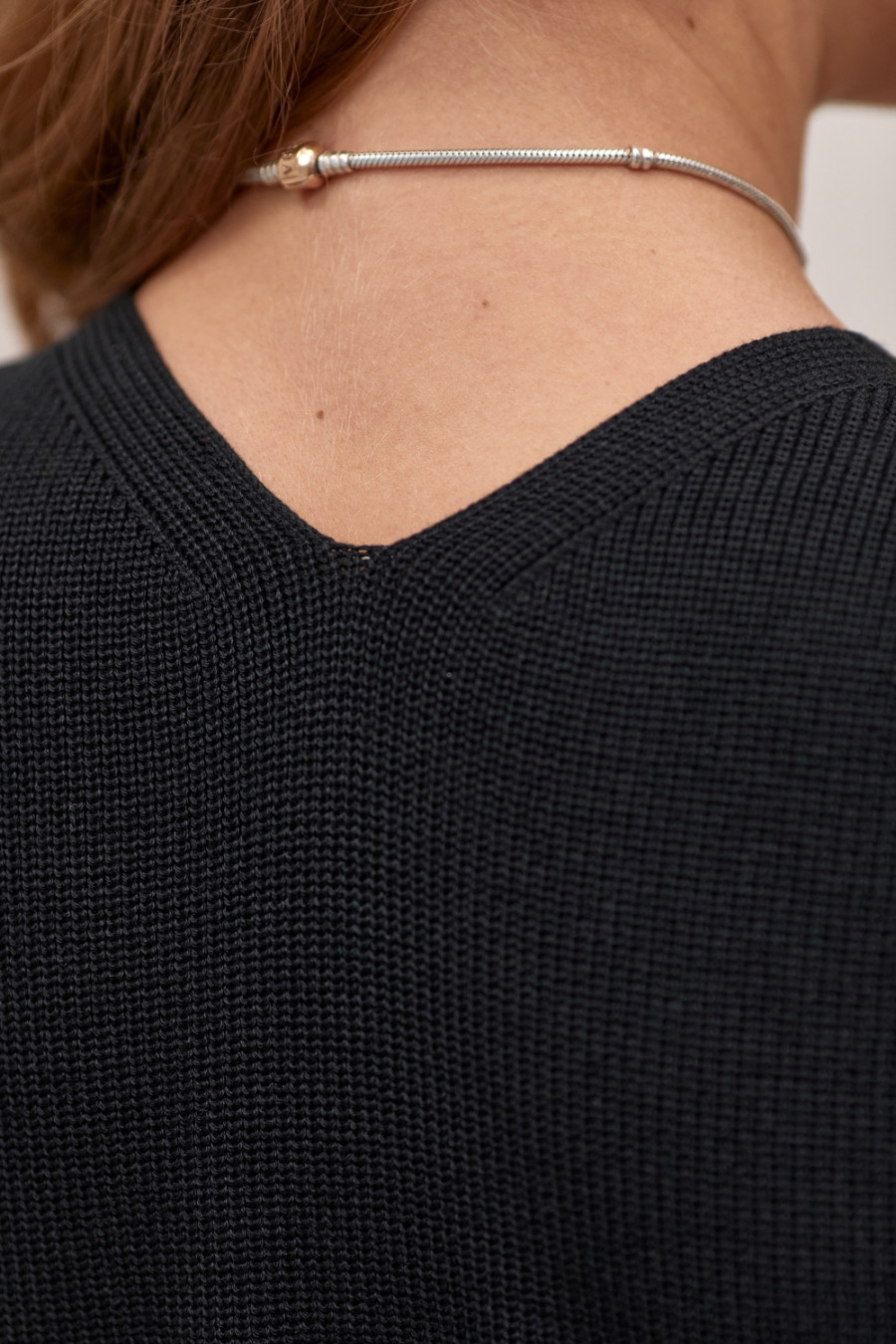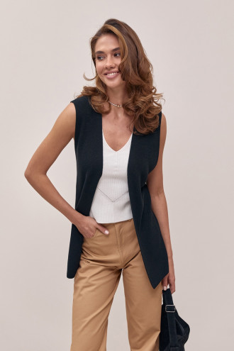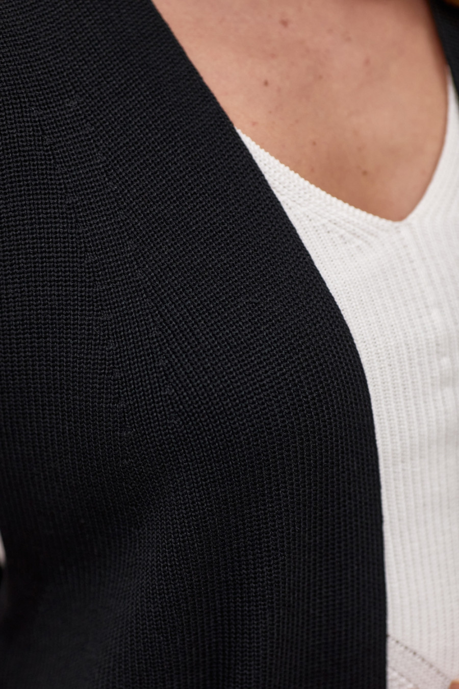 Элегантный жилет «Лейма» черного цвета изготовлен из шелковистой пряжи с добавлением вискозы и хлопка. Такой состав позволяет холсту нежно драпироваться, одновременно хорошо держа форму. Фактура – гладкое стабильное плетение. Силуэт – прямой, без застежек. Зона у плеч украшена особым узором, благодаря которому формируется проем.