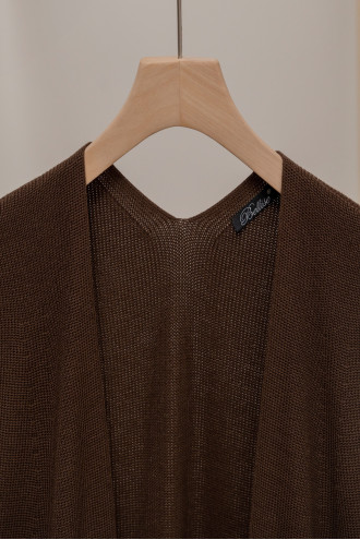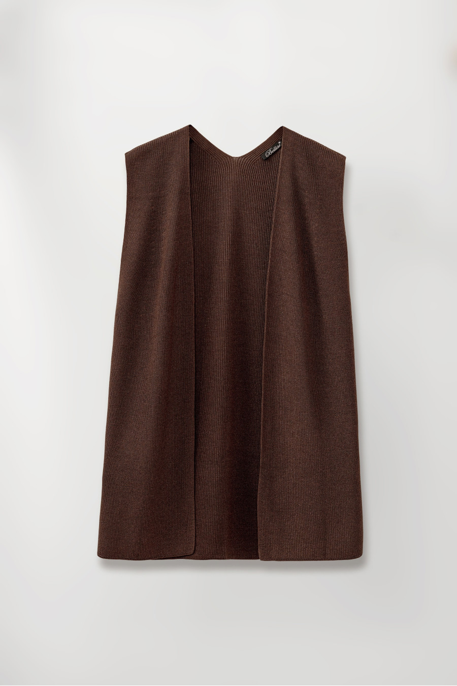 Элегантный жилет «Лейма» шоколадного цвета изготовлен из шелковистой пряжи с добавлением вискозы и хлопка. Такой состав позволяет холсту нежно драпироваться, одновременно хорошо держа форму. Фактура – гладкое стабильное плетение. Силуэт – прямой, без застежек. Зона у плеч украшена особым узором, благодаря которому формируется проем.