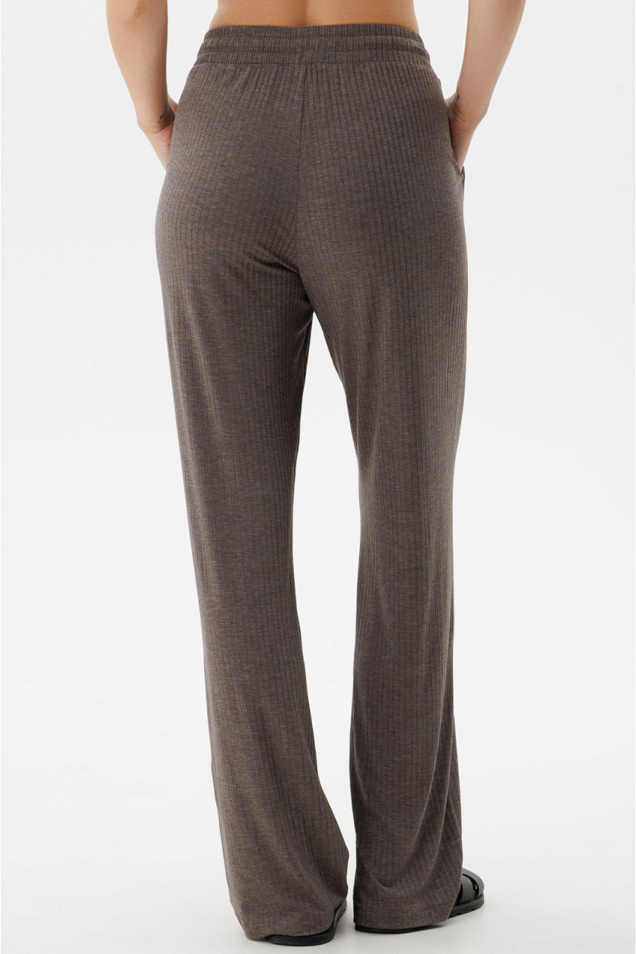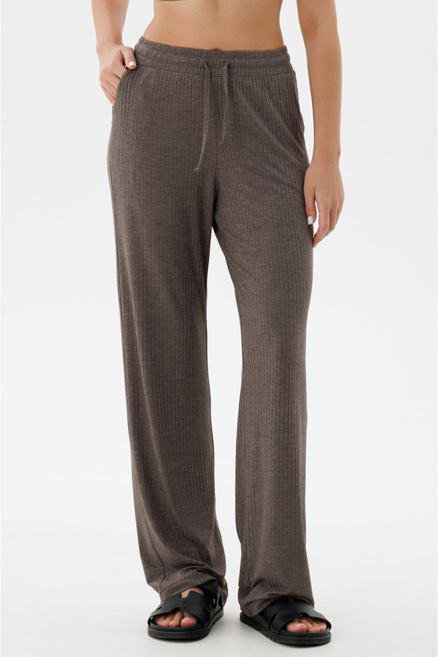 Комфортные удлиненные трикотажные штаны из фактурной вискозной трикотажной ткани в рубчик коричневого цвета, которые дополнят демисезонный гардероб. Модель свободного фасона со средней посадкой, широким поясом-резинкой с кулиской-завязками, прорезными карманами на уровне бедер. Штаны подчеркнут женственность и стройность форм, придадут повседневному образу сдержанность и лаконичность. Наряд будет уместен в гардеробе активной барышни и сочетается и с классическим офисным гольфом, и с объемным свитером или толстовкой.