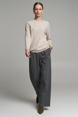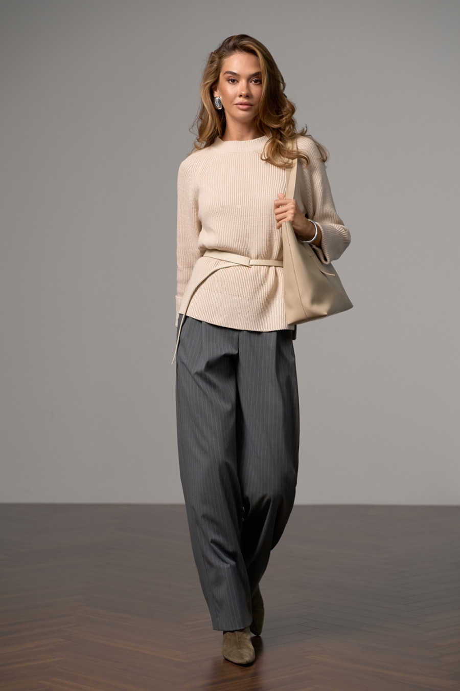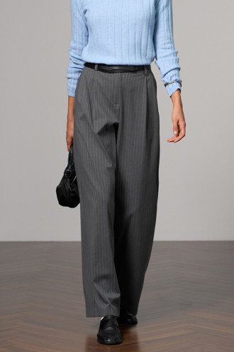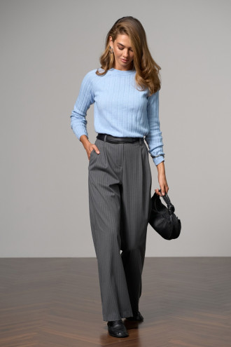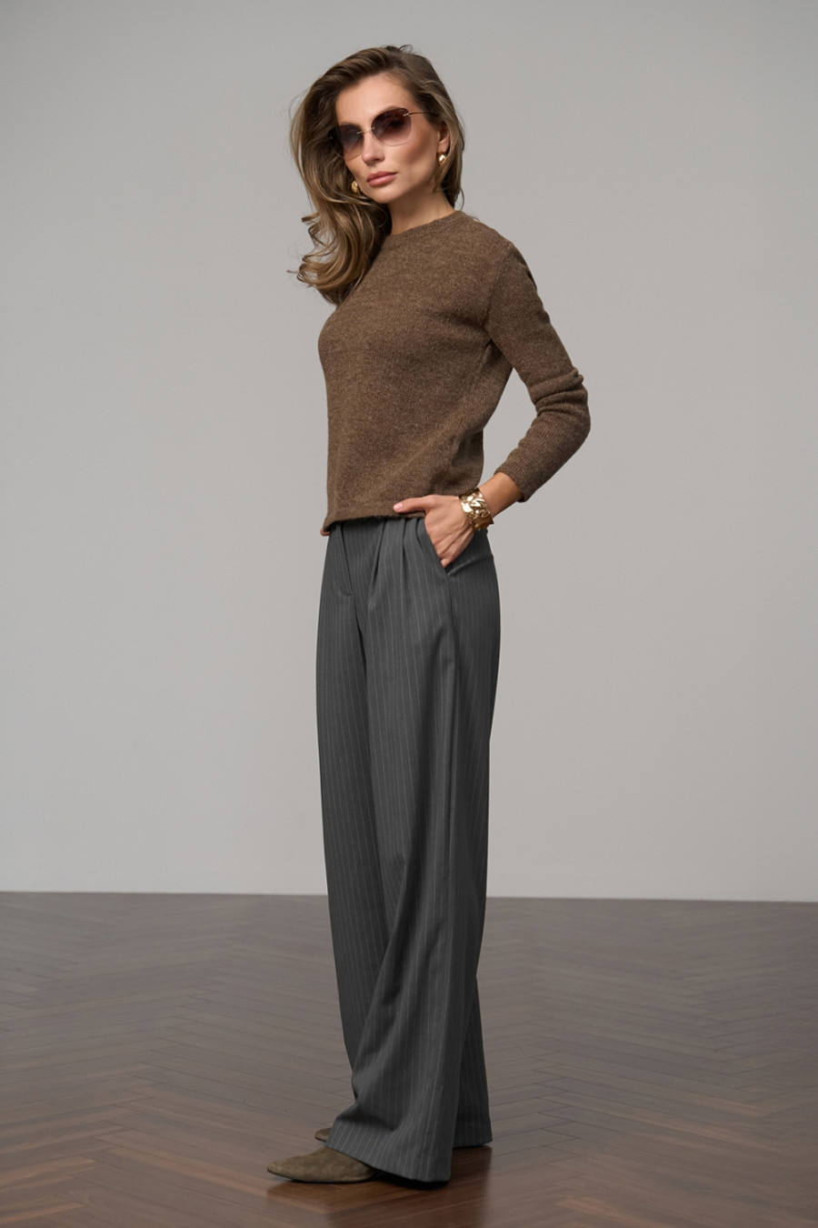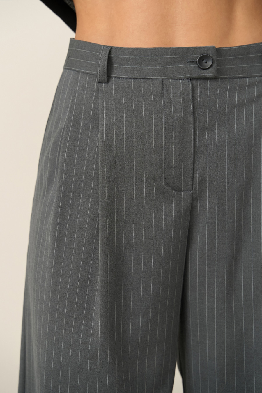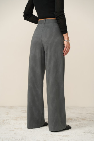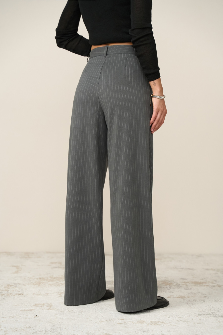 Элегантные брюки "Франсуаза" графитового цвета в тонкую полоску изготовлены из ткани средней плотности с добавлением вискозы. Имеют прямой крой. Хорошо драпируются по фигуре за счет складок-защипов спереди и вытачек на ягодицах. Застегиваются спереди на молнию и пуговицу. Украшенные карманами, вшитыми в боковые швы. Благодаря этому форма брюк не меняется, а практичность возрастает.