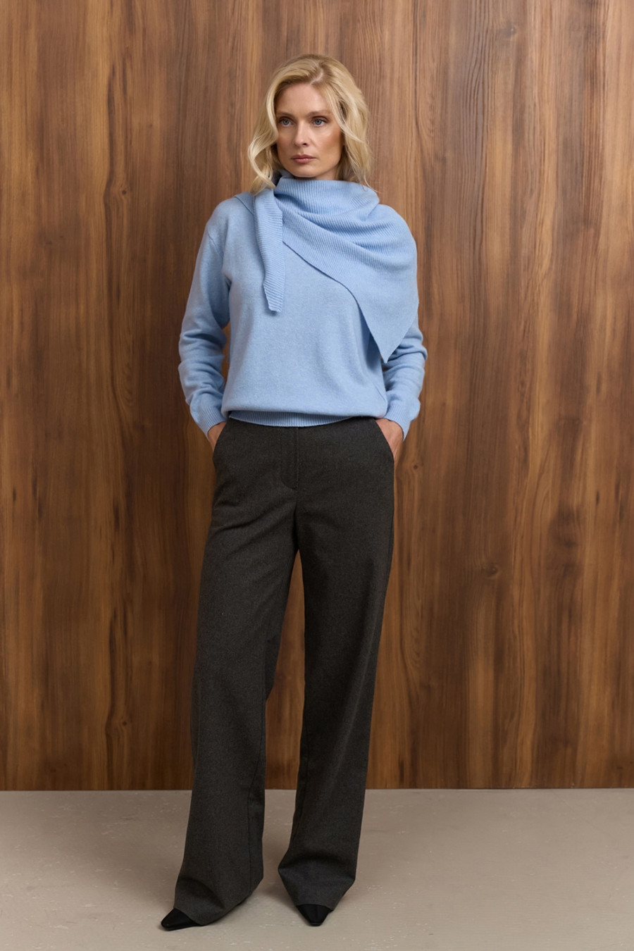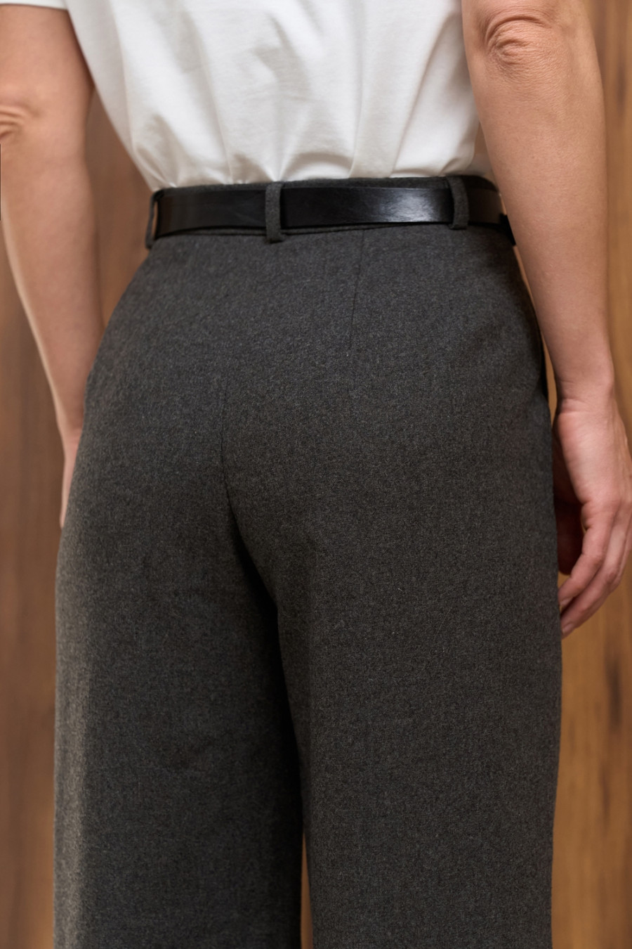 Элегантные брюки «Риджи» цвета мокрого асфальта изготовлены из полушерстяной ткани средней плотности с добавлением вискозы и эластана. Имеют прямой крой. Хорошо драпируются по фигуре за счет складок-защипов спереди и вытачек на ягодицах. Застегиваются спереди на молнию и пуговицу. Украшенные карманами, вшитыми в боковые швы. Благодаря этому форма брюк не меняется, а практичность растет.