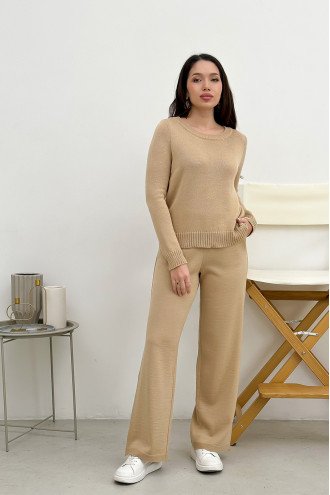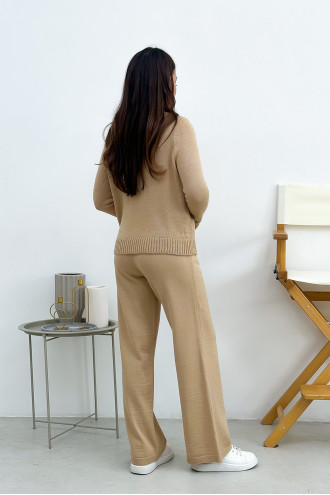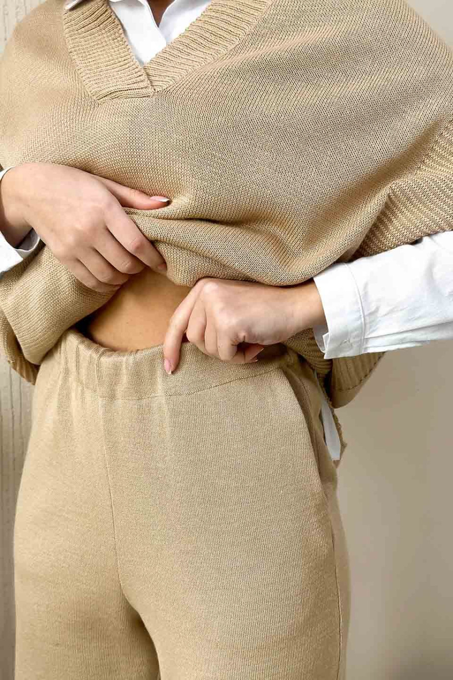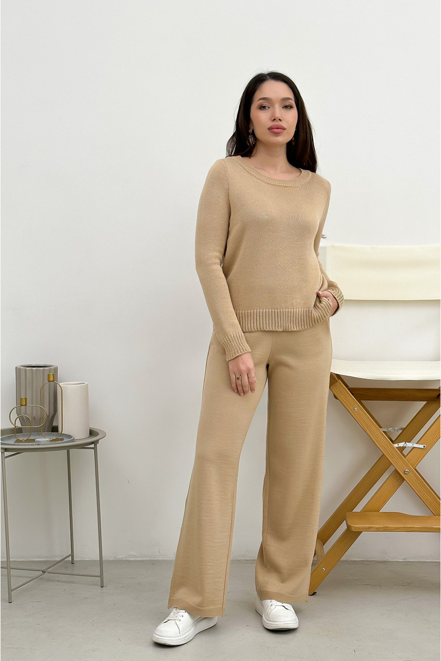 Стильные бежево-песочные демисезонные вязаные штаны из приятной к телу смессовой теплой пряжи с гладким узором-полотном, которые дополнят повседневный образ любой барышни. Модель свободного фасона с высокой посадкой, широким притачным поясом-резинкой, карманами на уровне бедер, манжетами внизу. Штаны визуально удлинят силуэт, подчеркнут хрупкость и утонченность форм. Наряд можно сочетать и с одноименным джемпером, и с другими вариантами верха из вашего гардероба.