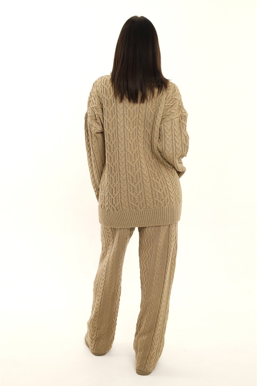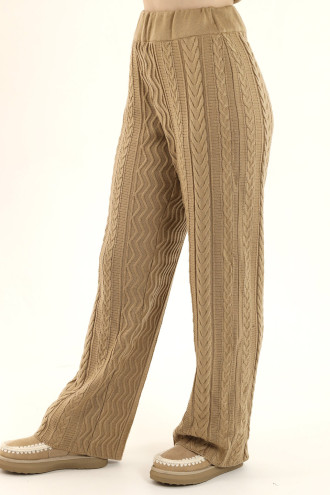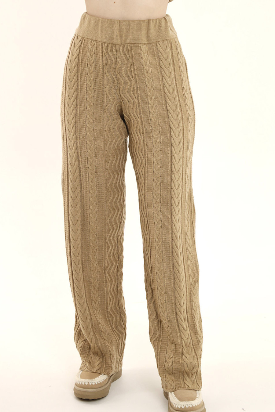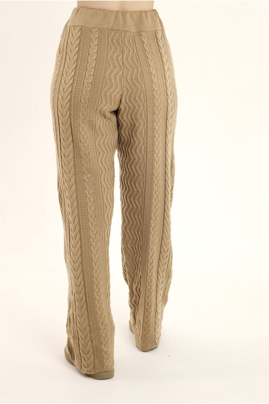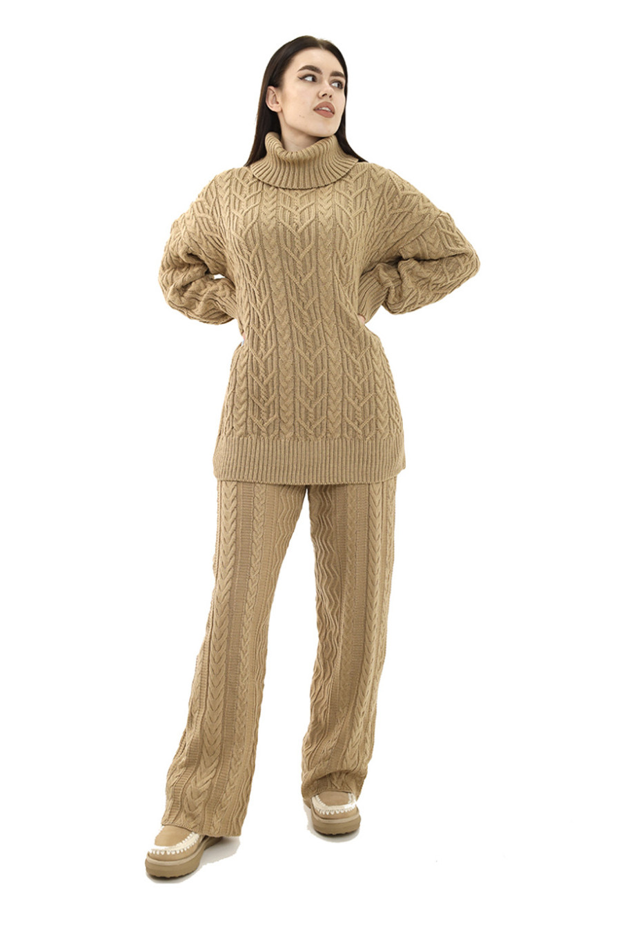 Стильные демисезонные удлиненные вязаные штаны из смессовой пряжи карамельно-бежевого цвета с объемным узором-косами и переплетениями, которые будут уместны в теплом гардеробе любой модницы. Модель свободного фасона с высокой посадкой, широким притачным поясом-резинкой. Штаны визуально удлинят силуэт, подчеркнут стройность и хрупкость форм. Наряд можно дополнить как одноименным свитером, так и свитшотом или туникой из вашего гардероба.