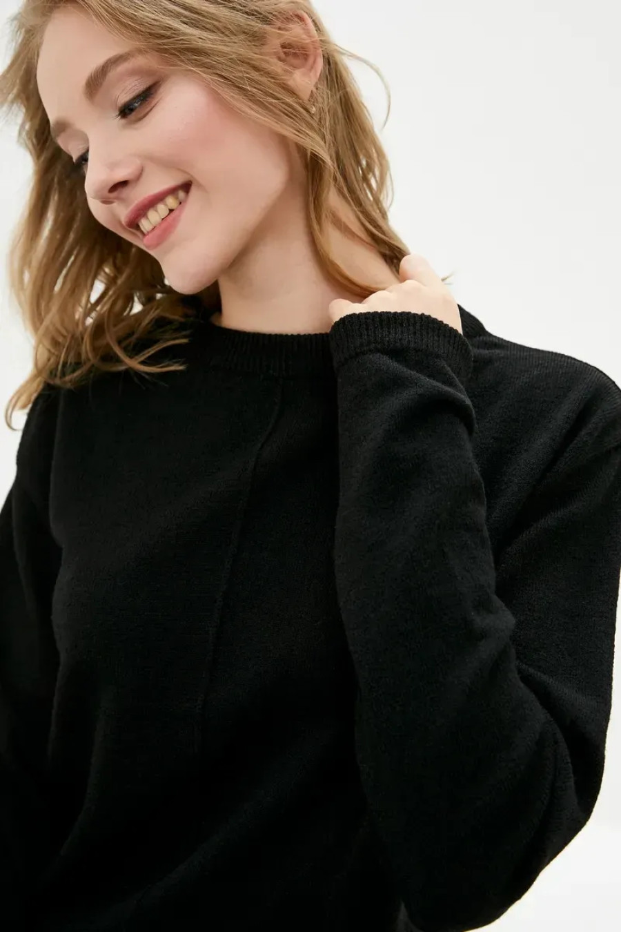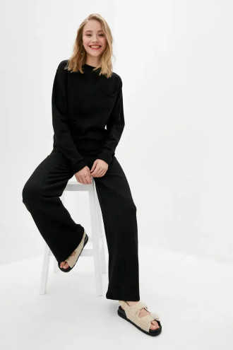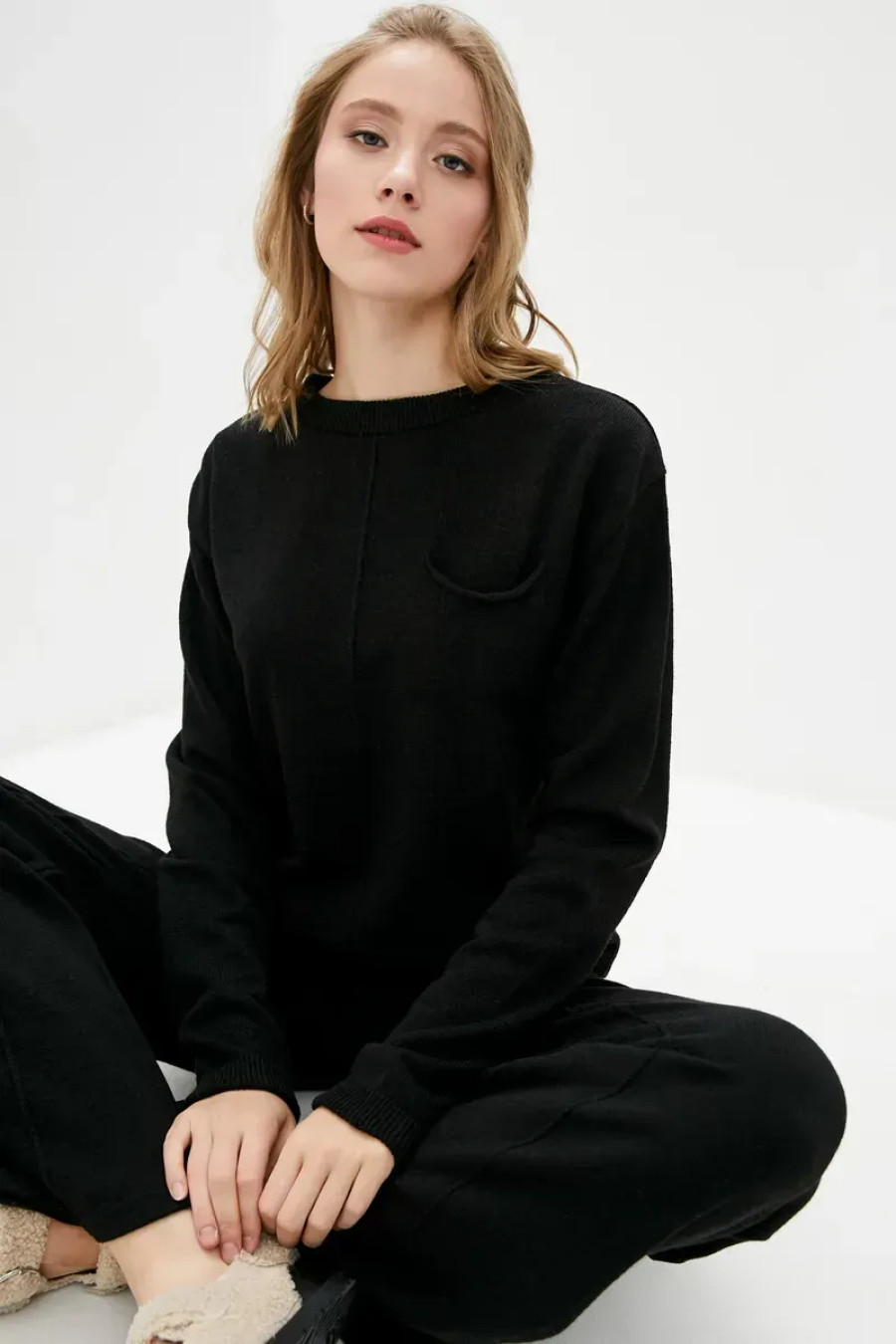 Вязаный костюм свободного фасона, обеспечивающий удобство и современный вид. Джемпер выполнен в комфортном крое, который удобно садится и не сковывает движения. Акцент - декоративный карман на груди, который придает образу характера и делает модель более выразительной и стильной. Брюки прямого фасона обеспечивают комфорт в течение дня и хорошо держат форму. Позади и спереди имеют аккуратные вывязанные карманы. Идеальный вариант для прохладного времени года.