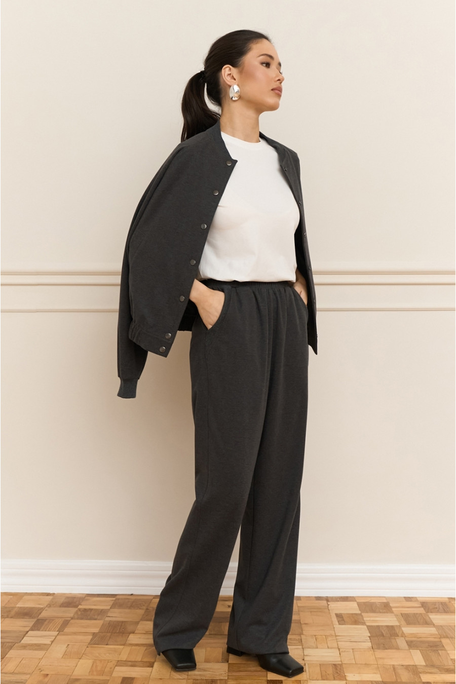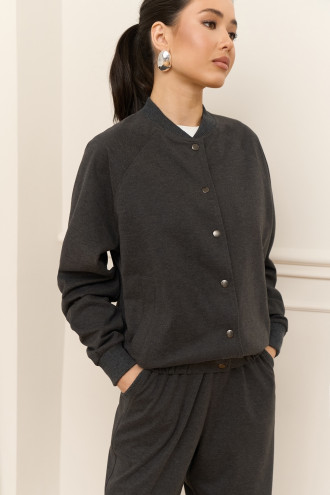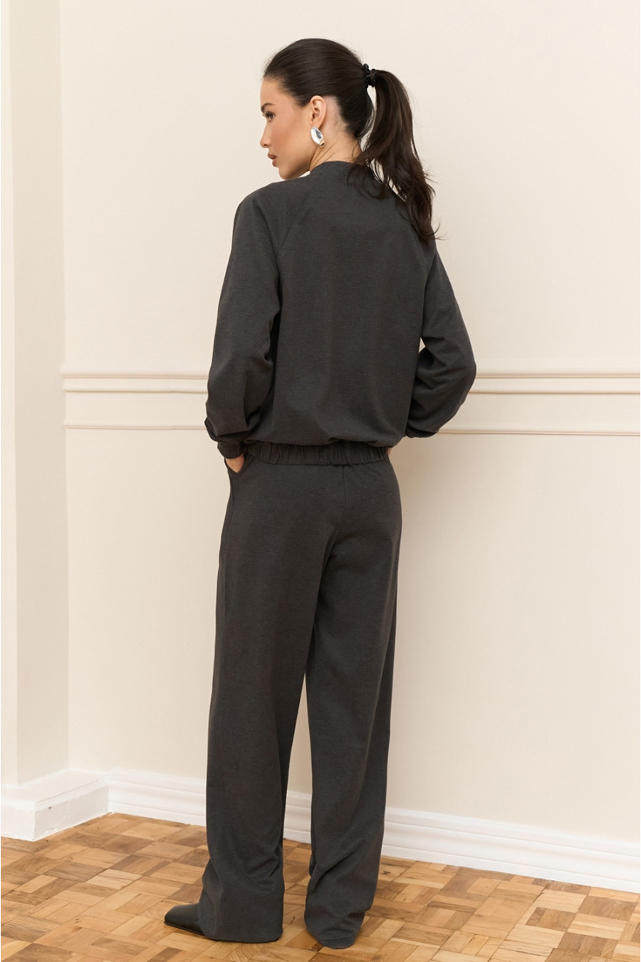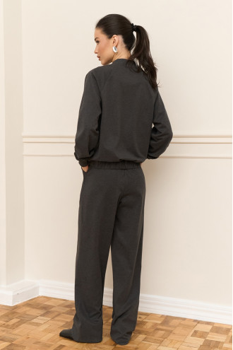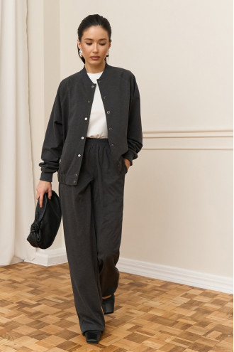 Демисезонный брючный костюм из смессовой вискозной ткани темно-графитового цвета, который дополнит модный образ. Модель состоит из бомбера свободного покроя с воротником-резинкой, длинными просторными рукавами-реглан с притачными манжетами-резинками и вшитой резинкой на подоле, застежками-кнопками на полочке, прорезными карманами и просторных удлиненных брюк с широким поясом-резинкой, с косыми карманами с декором на уровне бедер. Костюм подчеркнет стройность и хрупкость фигуры, придаст повседневному образу элегантность и сдержанность. Наряд дополнит теплый гардероб любой барышни.