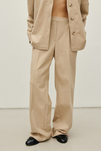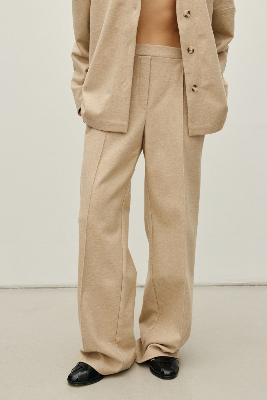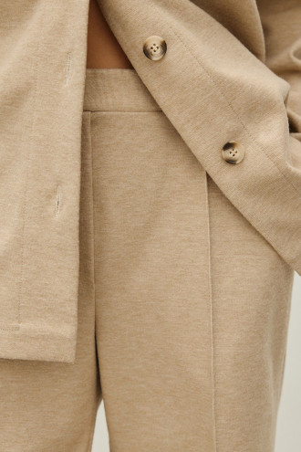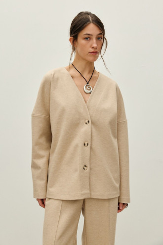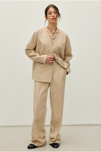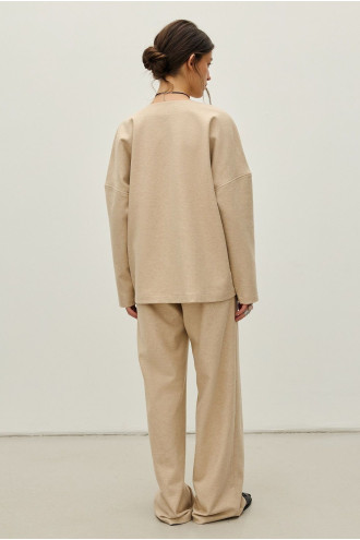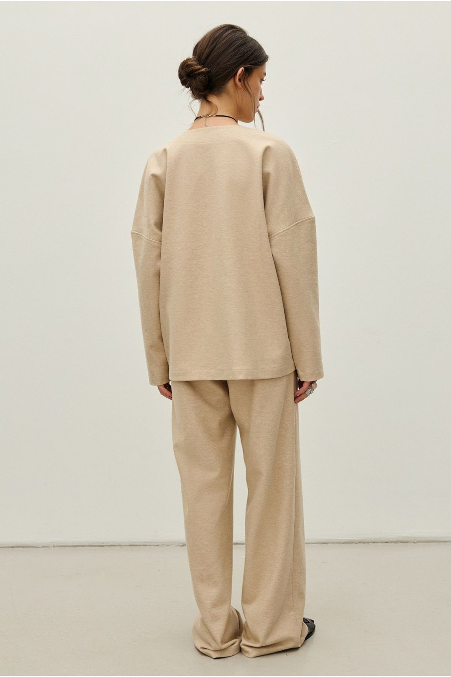 Бежево-песочный демисезонный брючный костюм из приятного к телу смессового вискозного трикотажа с шерстью. Модель состоит из просторного кардигана с V-образным вырезом декольте, приспущенной линией плеча, длинными рукавами без манжет, планкой с застежками-пуговицами и удлиненных свободных брюк с притачным поясом с резинкой, имитацией застежки, карманами на уровне бедер, швами-стрелками. Костюм подарит ощущение комфортной свободы движения и ощущения тепла, подчеркнет хрупкость и утонченность форм. Наряд подойдет и для офиса, и для досуга.