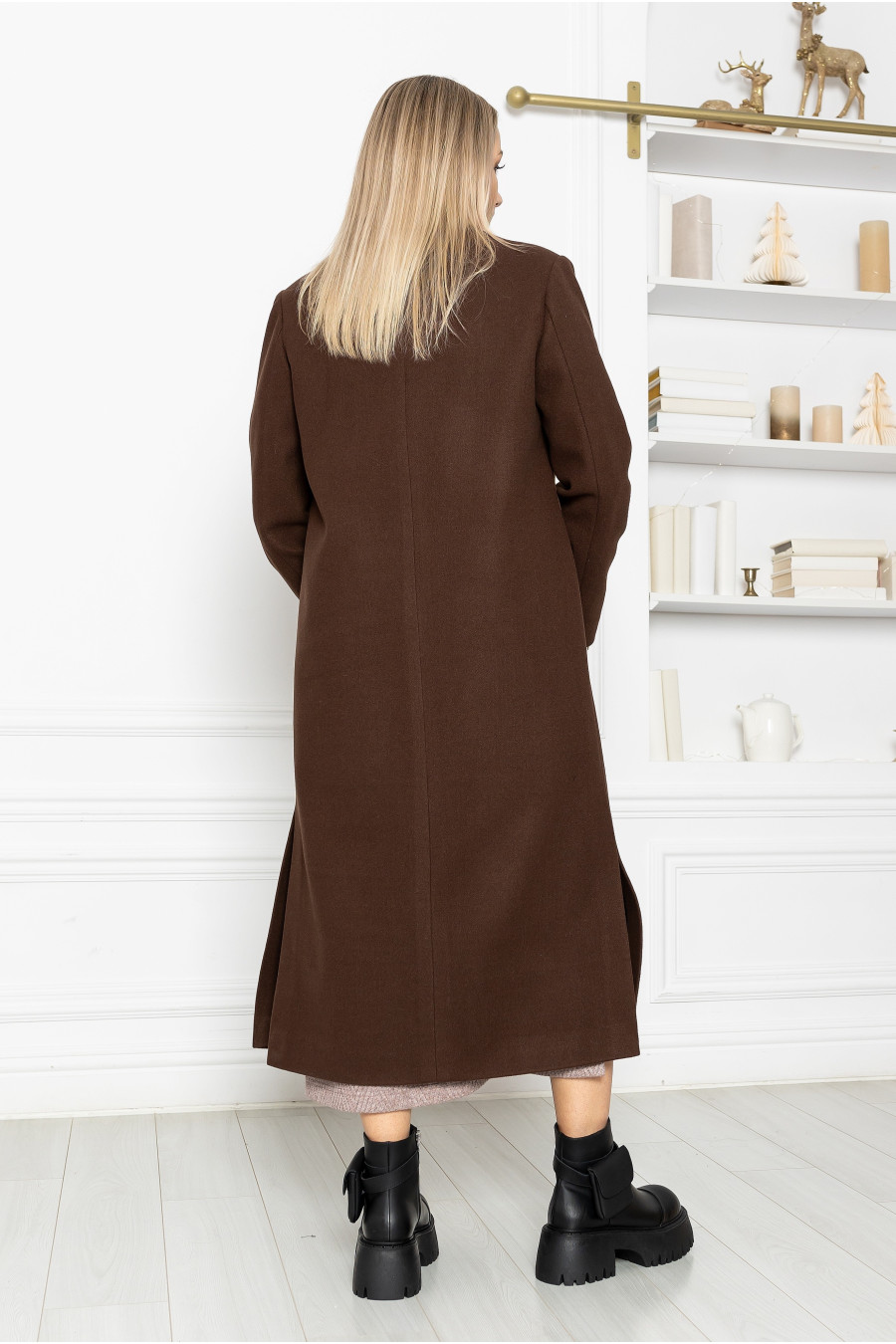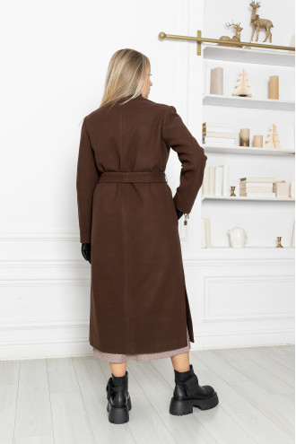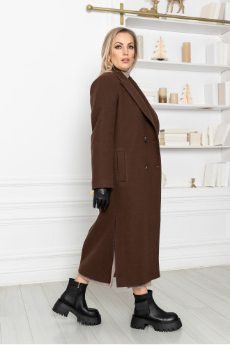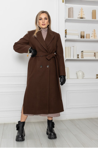 Длинное демисезонное двубортное пальто из плотного трикотажного кашемира цвета темного горького шоколада. Модель полуприлегающего силуэта с глубоким V-образным вырезом, отложным воротником на стойке с лацканами, длинными втачными рукавами без манжет, застежками-пуговицами, прорезными карманами на уровне бедер, съемным пояском из основной ткани со шлевками, шлицами в боковых швах, подкладкой в тон ткани. Пальто дополнит весенне-осенний образ любой модницы, придаст ему очарование и шарм. Наряд будет уместен как в классическом, так и в кэжуал гардеробе.
