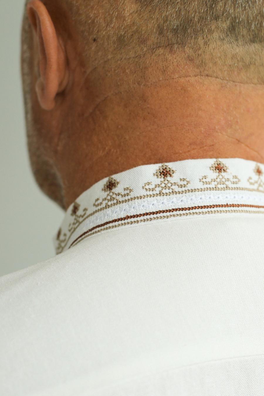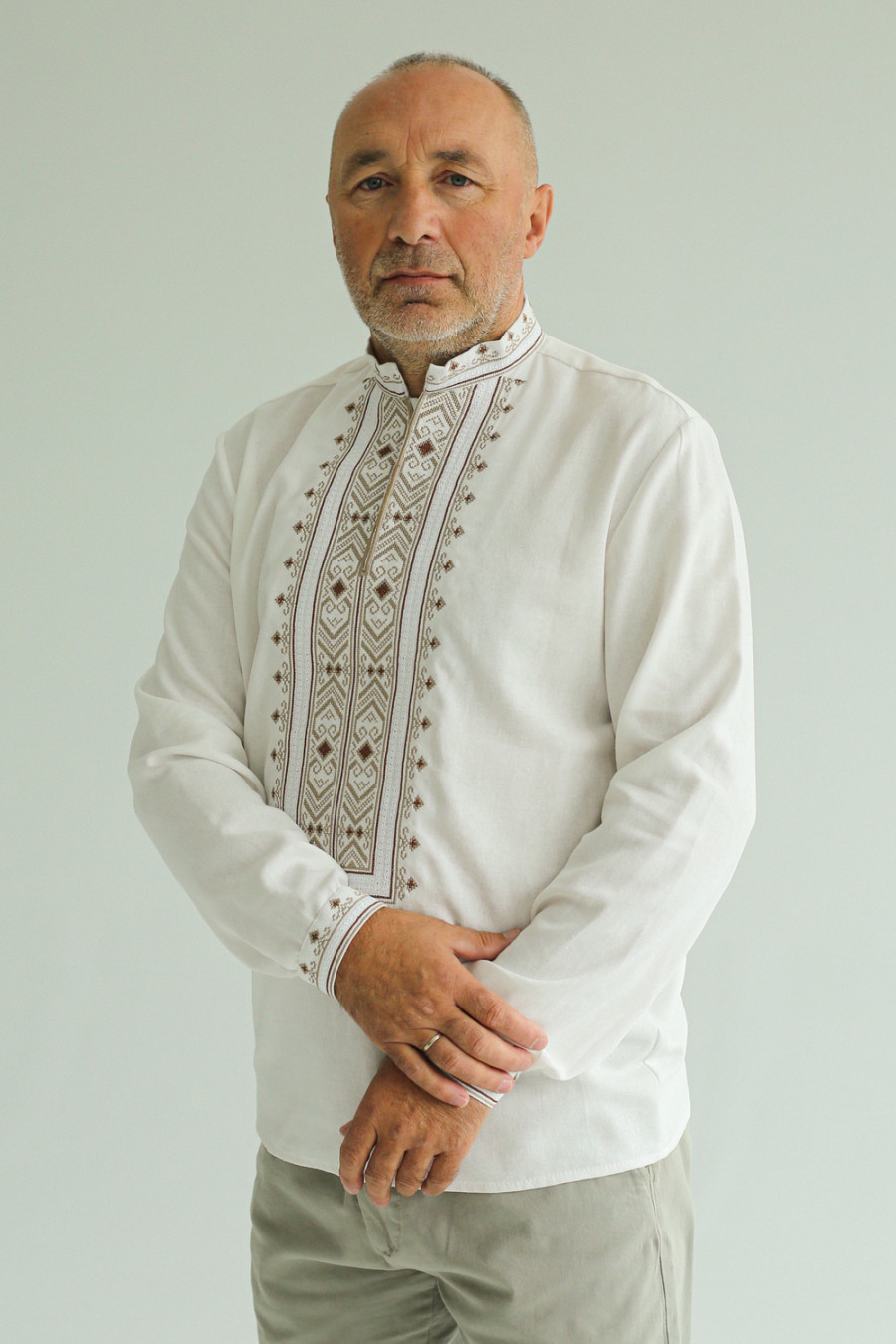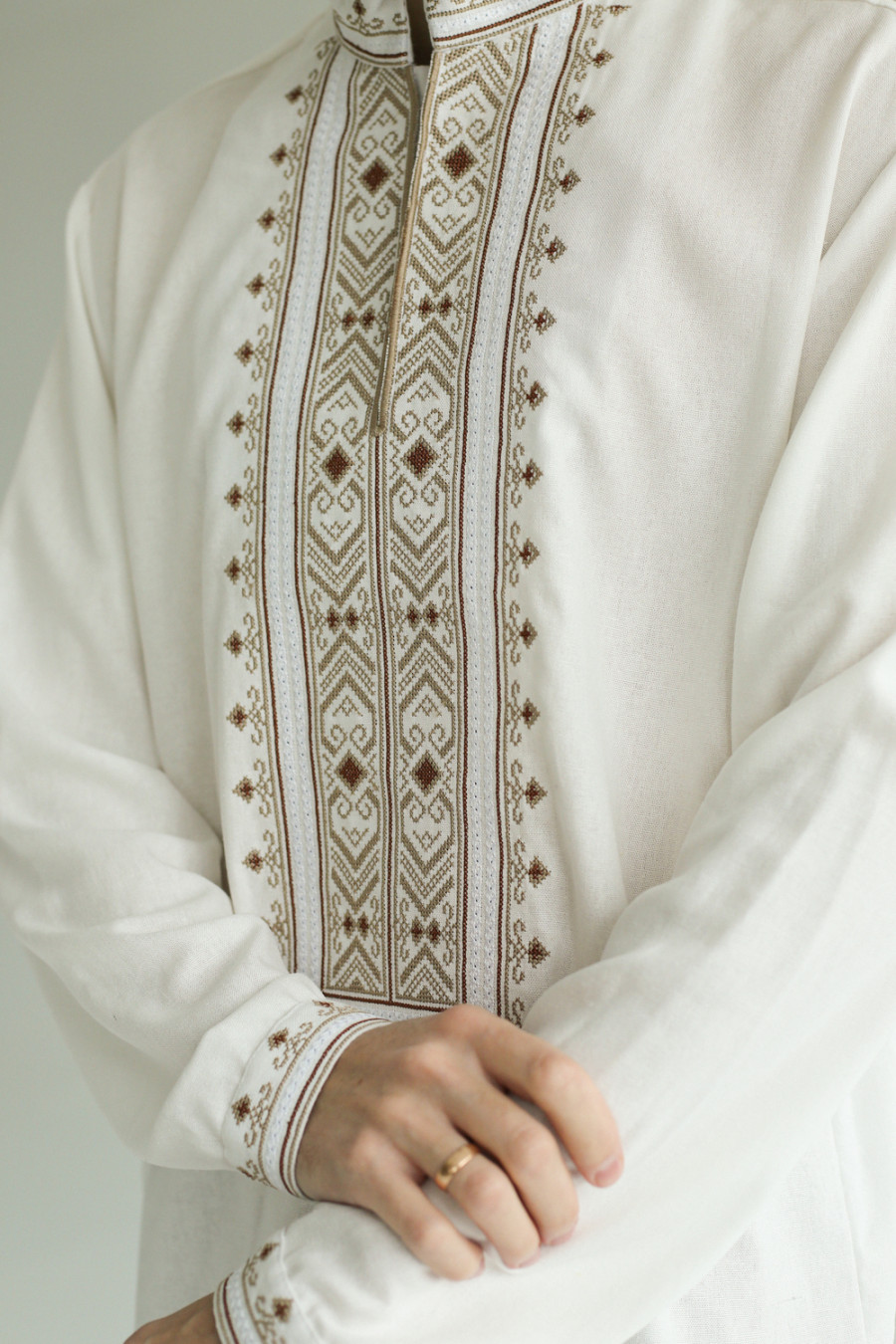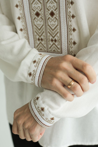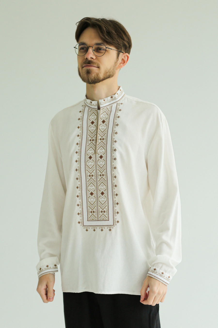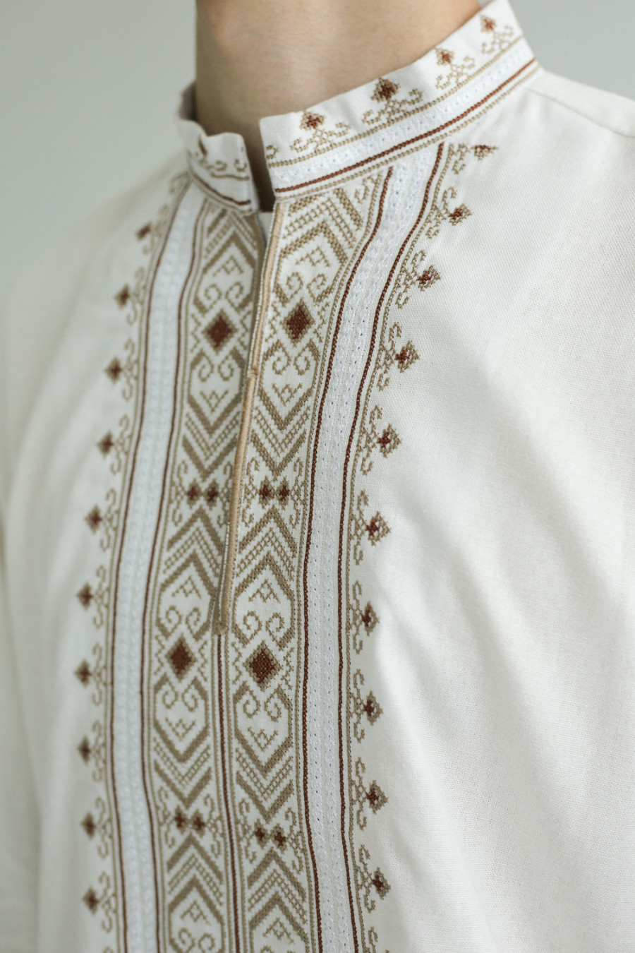 Елегантна сучасна чоловіча вишиванка з приємної до тіла змішаної лляної тканини кремово-білого кольору з вишитим орнаментом-декором. Модель вільного крою з комірцем-стійкою, вирізом із потаємною застібкою на поличці, приспущеною лінією плеча, відрізною кокеткою на спинці, довгими просторими рукавами з манжетами на застібці. Манишку, комір та манжети прикрашає геометричний орнамент хрестиком у кавово-бежевій гамі та біла мережка. Вишиванка прикрасить урочистий образ будь-якого чоловіка, додасть йому стриманості. Убрання стане вдалим варіантом і для ділової зустрічі, і для святкового заходу.